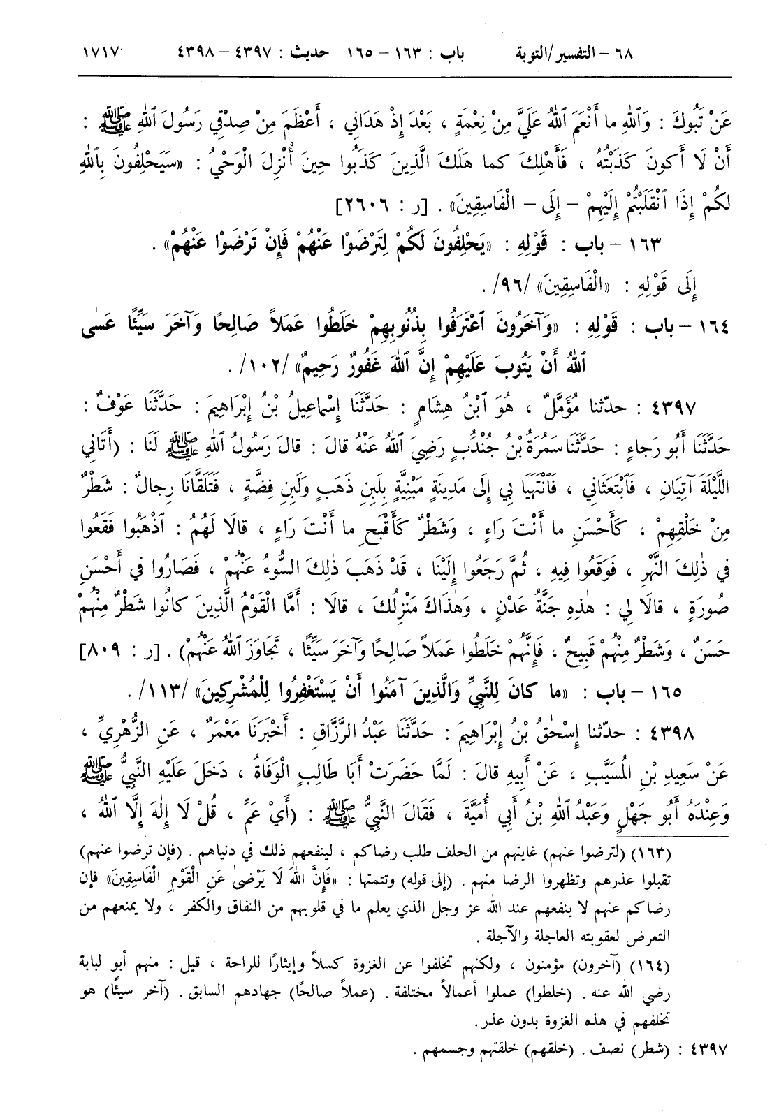166 - باب { لقد تاب الله على النبي والمهاجرين والأنصار الذين اتبعوه في ساعة العسرة من بعد ما كاد يزيغ قلوب فريق منهم ثم تاب عليهم إنه بهم رؤوف رحيم } / 117 /