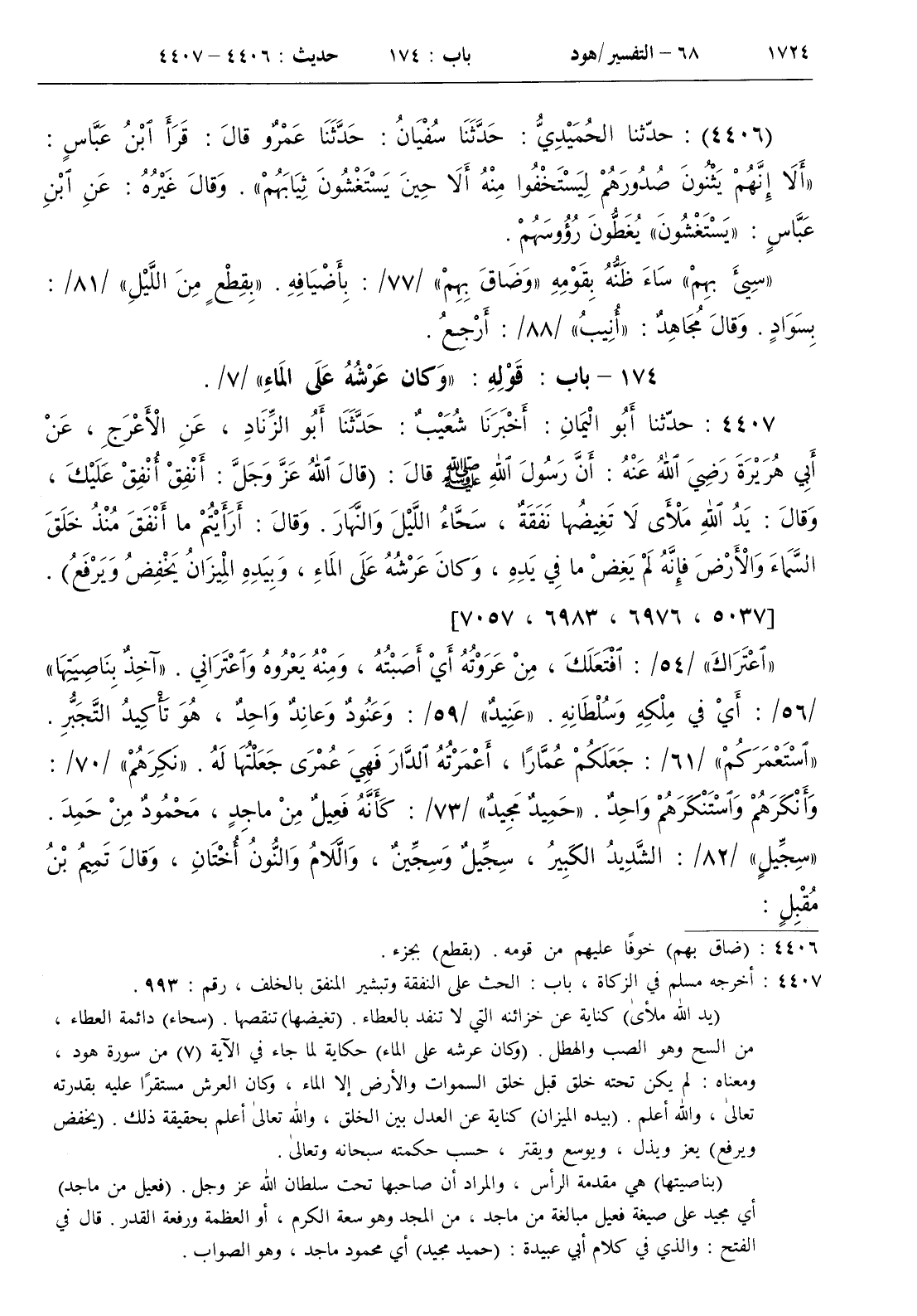 ( يد الله ملائ ) كناية عن خزائنه التي لا تنفد بالعطاء . ( تغيضها ) تنقصها . ( سحاء ) دائمة العطاء من السح وهو الصب والهطل . ( وكان عرشه على الماء ) حكاية لما جاء في الآية ( 7 ) من سورة هود ومعناه لم يكن تحته خلق قبل خلق السموات والأرض إلا الماء وكان العرش مستقرا عليه بقدرته تعالى والله أعلم . ( بيده الميزان ) كناية عن العدل بين الخلق والله تعالى أعلم بحقيقة ذلك . ( يخفض ويرفع ) يعز ويذل ويوسع ويقتر حسب حكمته سبحانه وتعالى . ( بناصيتها ) هي مقدمة الرأس والمراد أن صاحبها تحت سلطان الله عز و جل . ( فعيل من ماجد ) أي مجيد على صيغة فعيل مبالغة من ماجد من المجد وهو سعة الكرم أو العظمة ورفعة القدر . قال في الفتح والذي في كلام أبي عبيدة ( حميد مجيد ) أي محمود ماجد وهو الصواب . ( ورجلة ) ورب ذوي رجولية والرجلة الرجولية . ( البيض ) جمع البيضة وهو ما يوضع على الرأس من الحديد أثناء القتال . ( ضاحية ) في وقت الضحوة . ( الأبطال ) جمع بطل وهو الشجاع . ( سجينا ) شديدا يثبت من وقع فيه فلا يبرح مكانه . ( تستظهر به ) تستعين به . ( رست ) ركدت واستقرت . ( مجراها ومرساها ) بضم الميم وفتح الراء فيهما وفي قراءة بفتح الميم وإمالة الراء وثالثة بضم الميم وإمالة الراء والقراءات الثلاث متواترة ]