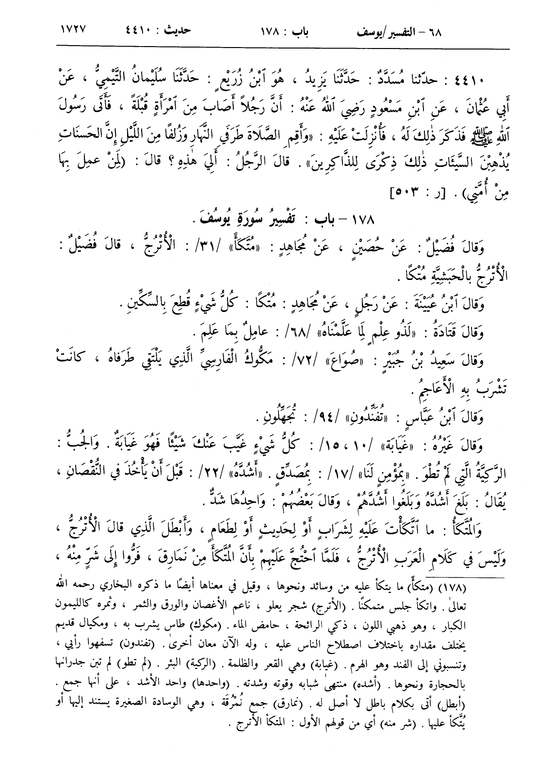 [ ش ( متكأ ) ما يتكأ عليه من وسائد ونحوها وقيل معناها أيضا ما ذكره البخاري رحمه الله تعالى . واتكأ جلس متمكنا . ( الأترج ) شجر يعلو ناعم الأغصان والورق والثمر وثمره كالليمون الكبار وهو ذهبي اللون ذكي الرائحة حامض الماء . ( مكوك ) طاس يشرب به ومكيال قديم يختلف مقداره باختلاف اصطلاح الناس عليه وله الآن معان أخرى . ( تفندون ) تسفهوا رأيي وتنسبوني إلى الفند وهو الهرم . ( غيابة ) وهي القعر والظلمة . ( الركية ) البئر . ( لم تطو ) لم تبن جدرانها بالحجارة ونحوها . ( أشده ) منتهى شبابه وقوته وشدته . ( واحدها ) واحد الأشد على أنها جمع . ( أبطل ) أتى بكلام باطل لا أصل له . ( نمارق ) جمع نمرقة وهي الوسادة الصغيرة يستند إليها أو يتكأ عليها . ( شر منه ) أي من قولهم الأول المتكأ الأترج . ( البظر ) قطعة لحم ناتئة في فرج الأنثى وقد تستطيل وتقطع في البلدان الحارة وهو ختان المرأة . ( متكاء ) هي المرأة التي لم تختن . ( فإن كان . . ) إي إن كان هناك أترج أحضرته امرأة العزيز فإنه يكون بعد المتكأ الذي هيأته لهن . ( شغفها ) استولى حبه على قلبها . ( المشغوف ) هو الذي بلغ به الحب أقصاه وشغله محبوبه عما سواه . ( أضغاث أحلام ) أخلاط مشتبهة ورؤيا كاذبة لا أصل لها . ( الميرة ) الطعام نمير أهلنا نجلب لهم الطعام . ( السقاية ) هي إناء كان يوسف عليه السلام يشرب فيه فجعله مكيالا لئلا يكتالوا بغيره فيظلموا وقيل هي الصواع الذي كان يشرب به الملك ثم جعل مكيالا يكال به . ( حرضا ) من الحرض وهو الفساد في الجسم والعقل من الحزن أو الهم . ( فتحسسوا ) من التحسس وهو طلب الخبر بالحاسة أو هو تفعل من الإحساس وهو المعرفة . ( غاشية ) جائحة عامة مهلكة من مرض ونحوه تغشاهم وتشملهم والغاشية الغطاء . ( مجللة ) من جلل الشيء تجليلا أي عمه . ( روح الله ) رحمته وفضله . ( خلصوا نجيا ) اعتزلوا حال كونهم متناجين - أي يتكالمون سرا فيما بينهم - ماذا يعملون في رجوعهم إلى أبيهم من غير أخيهم وماذا يقولون له ]