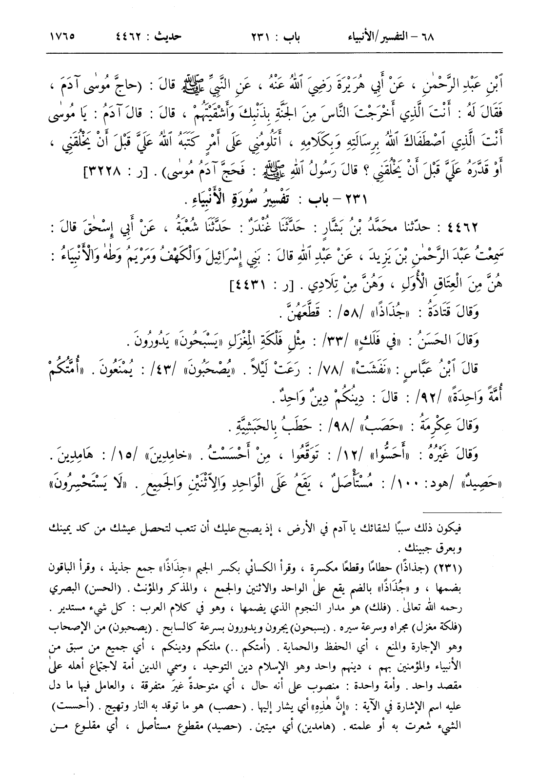 [ ش ( جذاذا ) حطاما وقطعا مكسرة وقرأ الكسائي بكسر الجيم { جذاذا } جمع جذيذ وقرأ الباقون بضمها و { جذاذا } بالضم يقع على الواحد والاثنين والجمع والمذكر والمؤنث . ( الحسن ) البصري رحمه الله تعالى . ( فلك ) هو مدار النجوم الذي يضمها وهو في كلام العرب كل شيء مستدير . ( فلكة مغزل ) مجراه وسرعة سيره . ( يسبحون ) يجرون ويدورون بسرعة كالسابح . ( يصحبون ) من الإصحاب وهو الإجارة والمنع أي الحفظ والحماية . ( أمتكم . . ) ملتكم ودينكم أي جميع من سبق من الأنبياء والمؤمنين بهم دينهم واحد وهو الإسلام دين التوحيد وسمي الدين أمة لاجتماع أهله على مقصد واحد . وأمة واحدة منصوب على أنه حال أي متوحدة غير متفرقة والعامل فيها ما دل عليه اسم الإشارة في الآية { إن هذه } أي يشار إليها . ( حصب ) هو ما توقد به النار وتهيج . ( أحسست ) الشيء شعرت به أو علمته . ( هامدين ) أي ميتين . ( حصيد ) مقطوع مستأصل أي مقلوع من أصله واللفظ في الأنبياء / 15 / { حصيدا } ( لا يعيون ) لا يعجزون ولا ينقطعون وفي نسخة ( يعيون ) بضم الياء من الإعياء وهو التعب الشديد . ( حسير ) كليل متعب أو هو المنقطع الواقف عيا وكللا . ( نكسوا ) عادوا إلى الضلال بعد أن استقاموا وأصل النكس قلب الشيء وجعل أعلاه أسفله . ( لبوس ) ما يلبس من ثياب ونحوها وتستعمل بمعنى السلاح . ( الدروع ) جمع درع وهو قميص ونحوه من زرد الحديد أو صفائحه . ( تقطعوا . . ) تفرقوا شيعا . ( الحسيس . . ) يشير إلى قوله تعالى { إن الذين سبقت لهم منا الحسنى أولئك عنها مبعدون . لا يسمعون حسيسها وهم فيما اشتهت أنفسهم خالدون } / الأنبياء 101 ، 102 / . والمعنى أن المؤمنين الذين كتبت لهم السعادة ووعدوا بالجنة يؤخذون يوم القيامة بعيدا عن النار بحيث لا