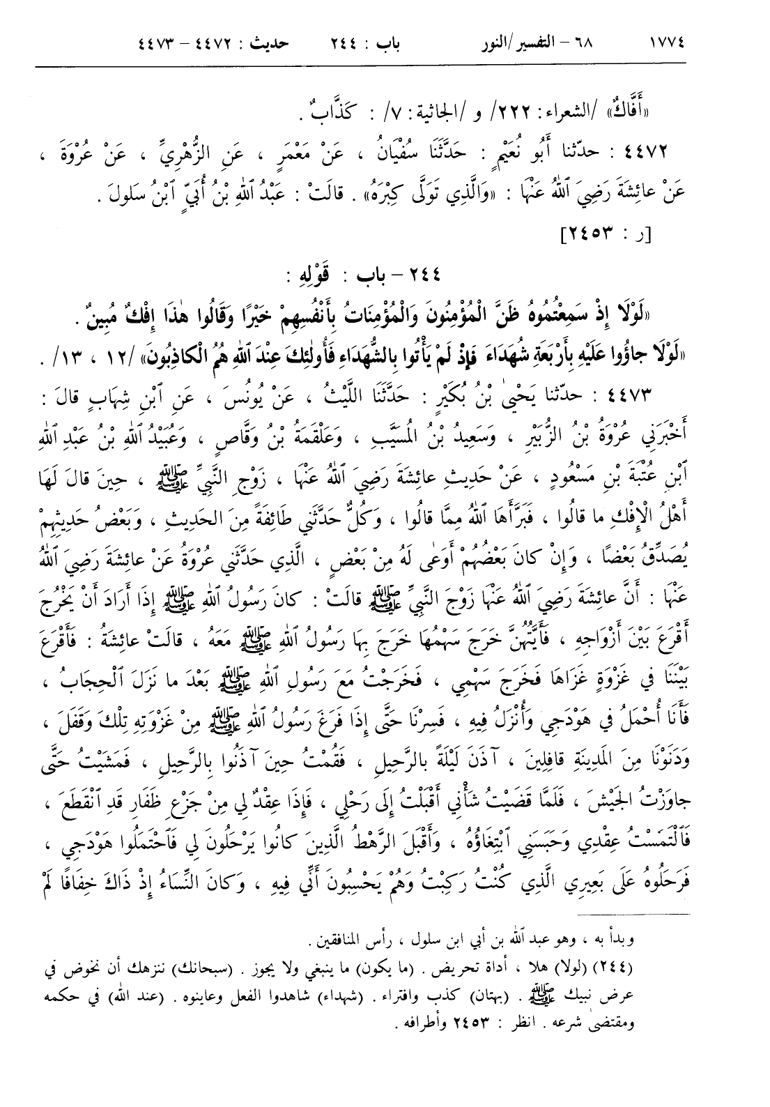 [ ش ( لولا ) هلا أداة تحريض . ( ما يكون ) ما ينبغي ولا يجوز . ( سبحانك ) ننزهك أن نخوض في عرض نبيك صلى الله علسه وسلم . ( بهتان ) كذب وافتراء . ( شهداء ) شاهدوا الفعل وعاينوه . ( عند الله ) في حكمه ومقتضى شرعه . انظر 2453 وأطرافه ]