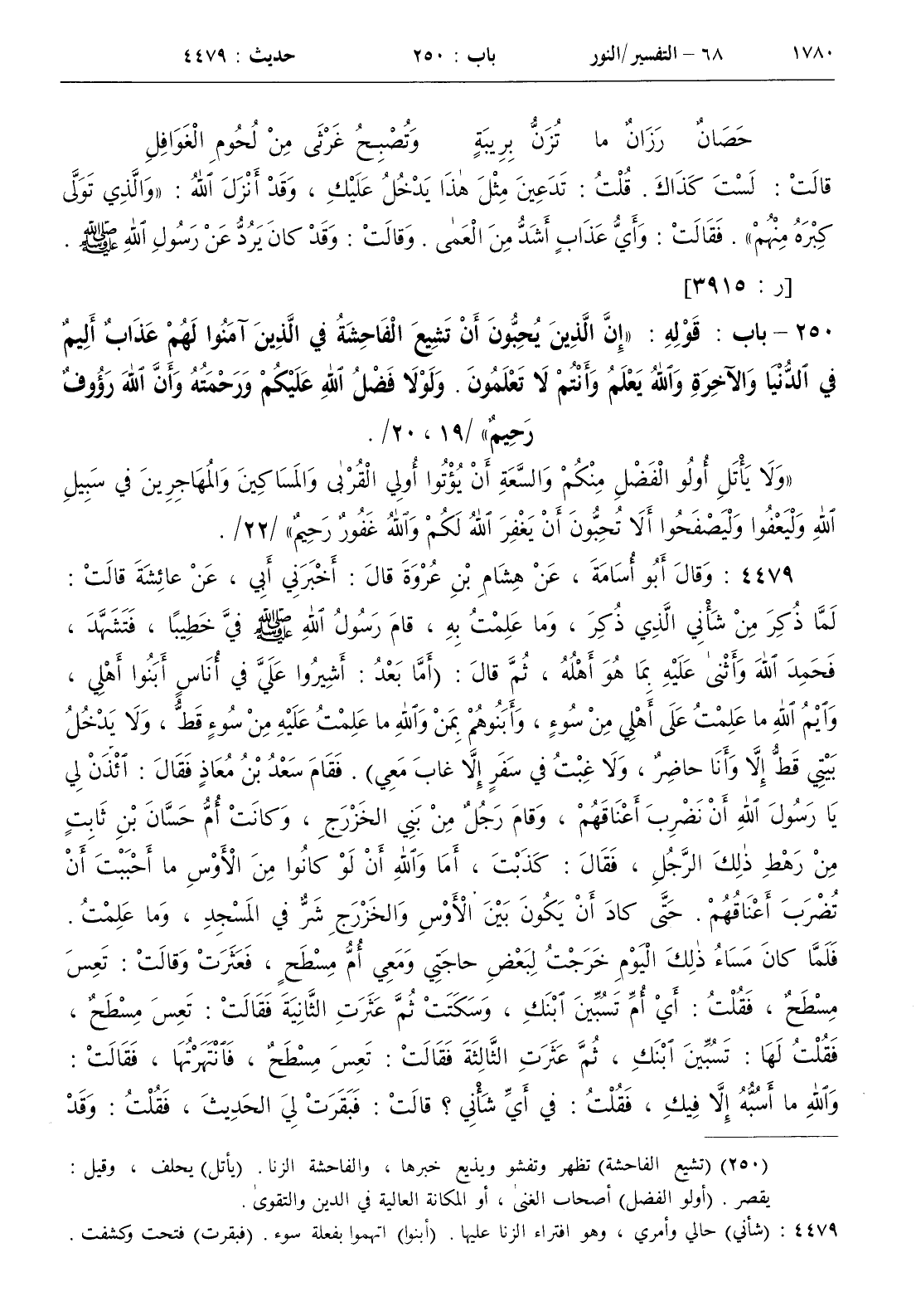 [ ش ( شأني ) حالي وأمري وهو افتراء الزنا عليها . ( أبنوا ) اتهموا بفعلة سوء . ( فبقرت ) فتحت وكشفت . ( كأني الذي خرجت له . . ) معنى الجملة إني دهشت بحيث أصبحت لا أعرف لأي أمر خرجت من البيت . ( وعكت ) مرضت بحمى . ( الغلام ) عبد مملوك صغير . ( لم يبلغ منها ) الاهتمام ولم تتأثر به . ( استعبرت ) جرت دمعتي من عيني . ( انتهرها ) بالغ في زجرها . ( بعض أصحابه ) الحاضرين . ( أسقطوا لها به ) صرحوا لها بالأمر . ( تبر الذهب ) القطعة الخالصة منه . ( قارفت ) فعلت وارتبكت . ( باءت به ) أقرت به ]