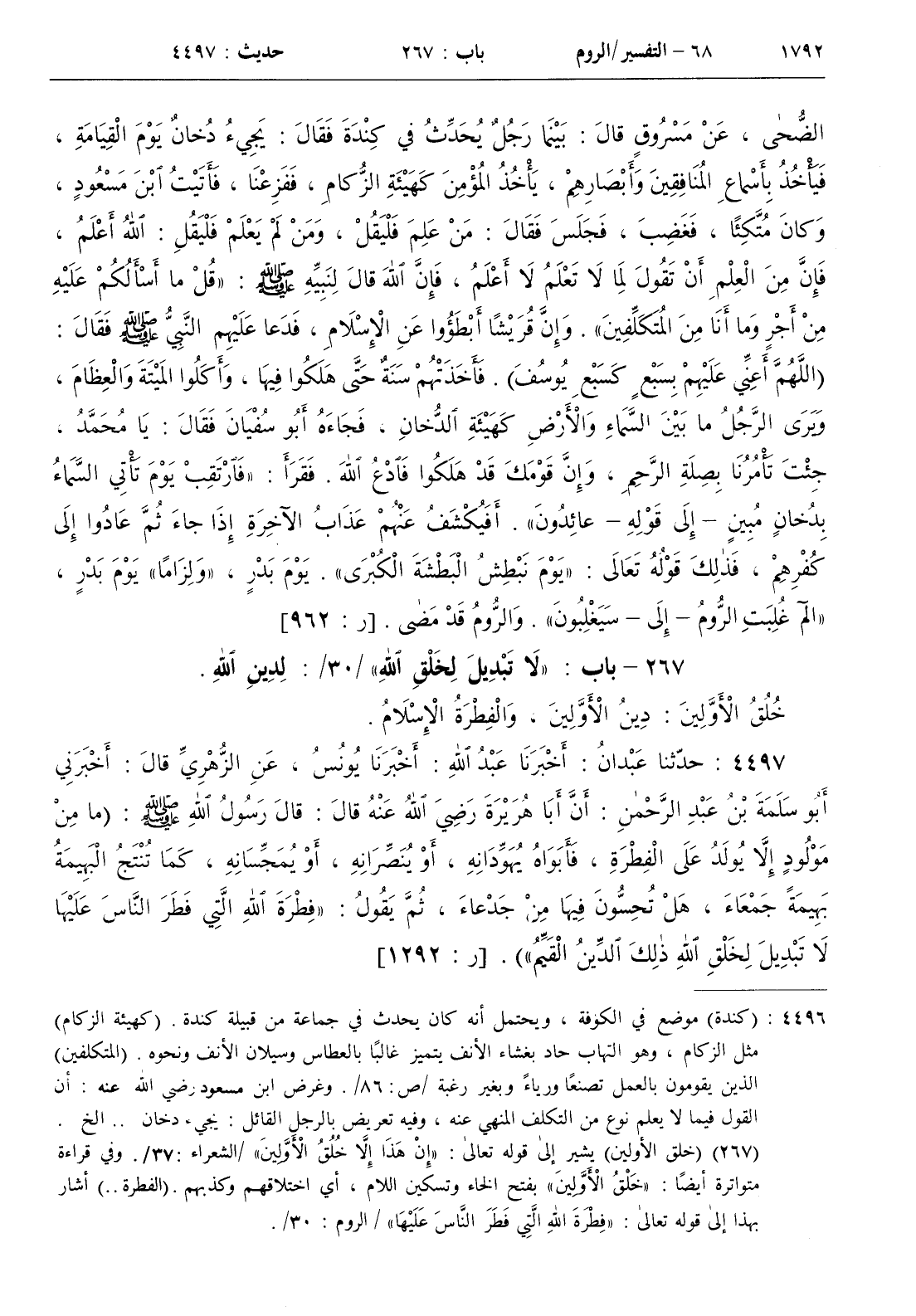 : ( ما من مولود إلا يولد على الفطرة فأبواه يهودانه أو ينصرانه أو يمجسانه كما تنتج البهيمة بهيمة جمعاء هل تحسون فيها من جدعاء ثم يقول { فطرة الله التي فطر الناس عليها لا تبديل لخلق الله ذلك الدين القيم } )