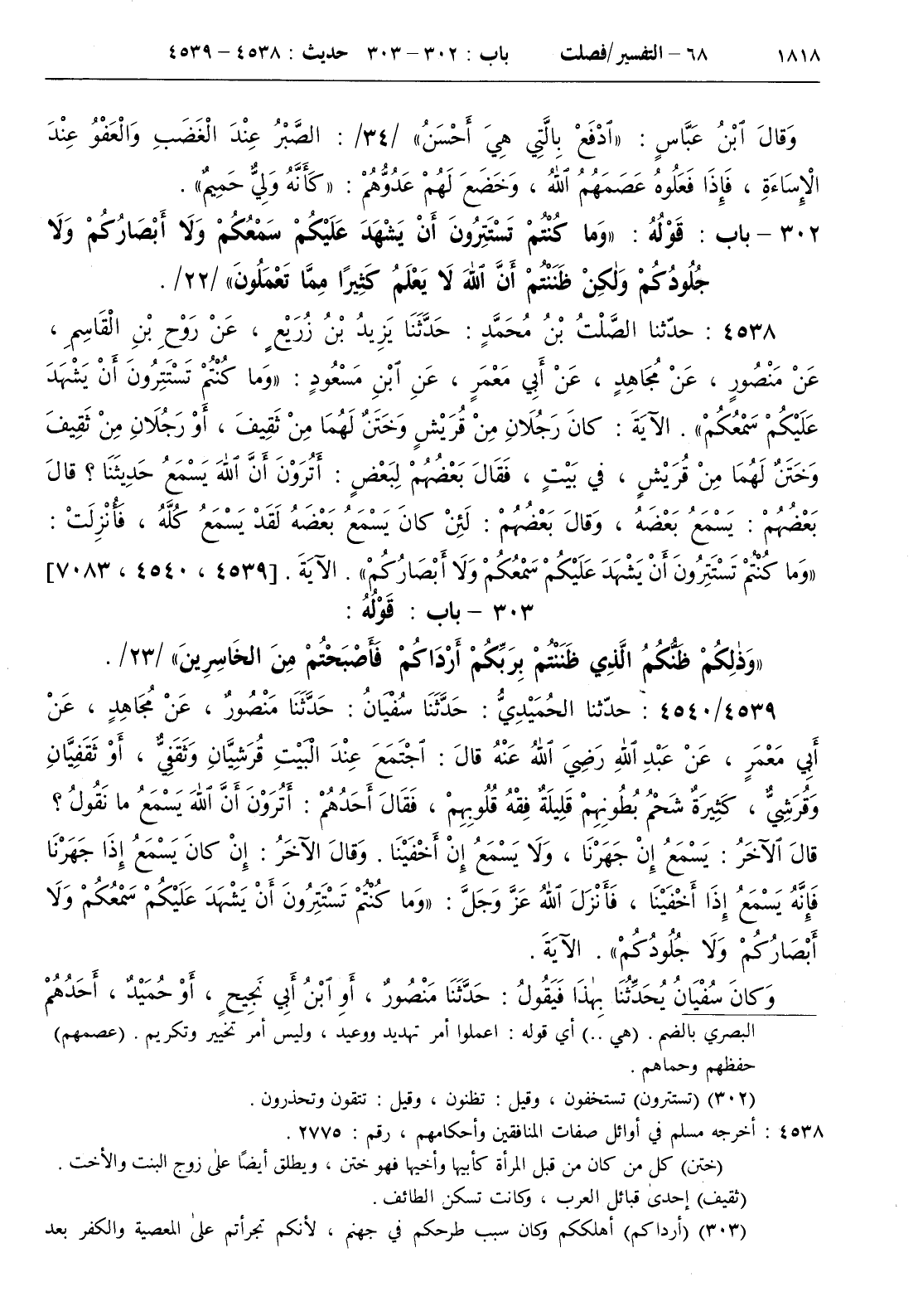 : { وما كنتم تستترون أن يشهد عليكم سمعكم } . الآية كان رجلان من قريش وختن لهما من ثقيف أو رجلان من ثقيف وختن لهما من قريش في بيت فقال بعضهم لبعض أترون أن الله يسمع حديثنا ؟ قال بعضهم يسمع بعضه وقال بعضهم لئن كان يسمع بعضه لقد يسمع كله فأنزلت { وما كنتم تستترون أن يشهد عليكم سمعكم ولا أبصاركم }