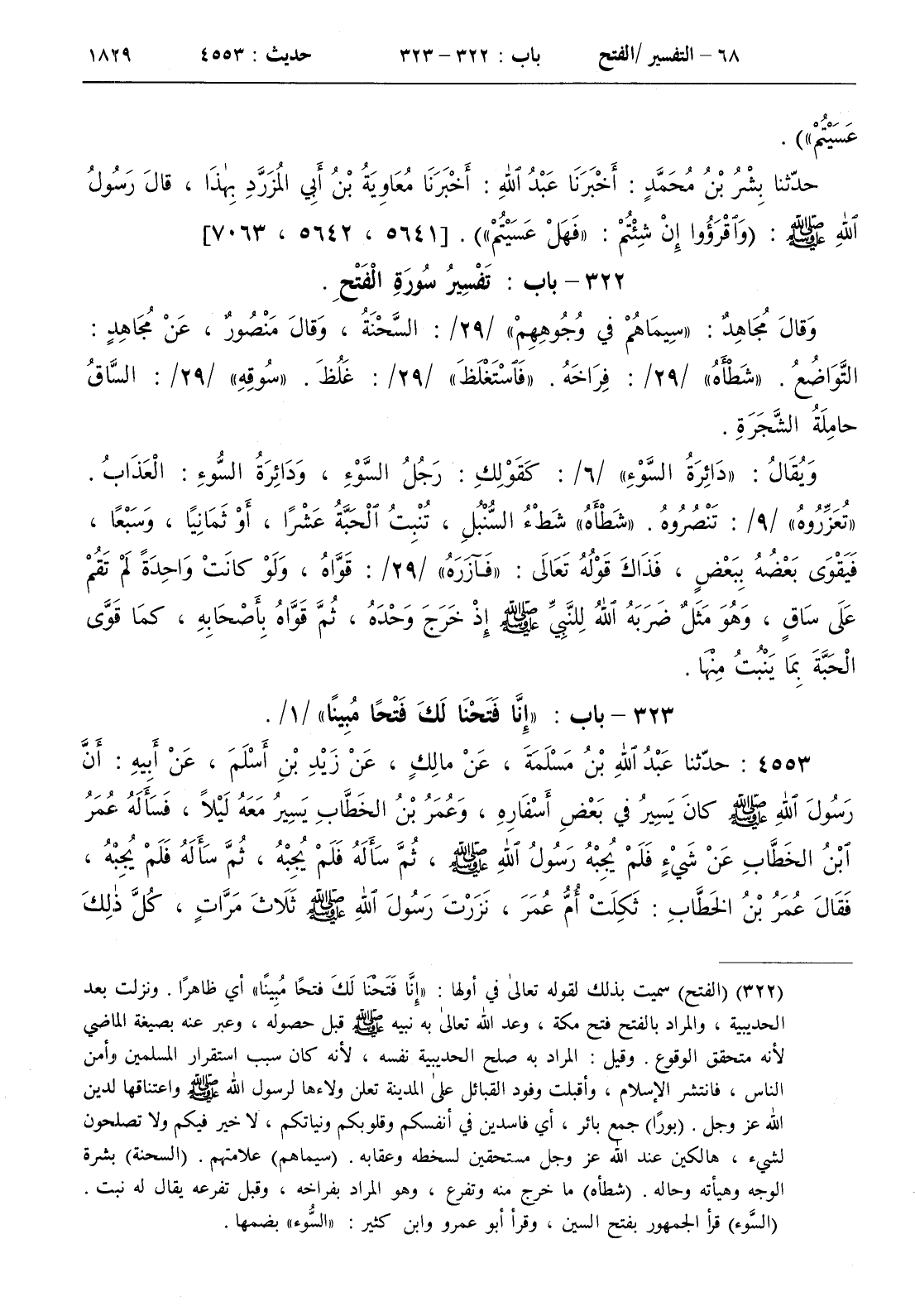 : أن رسول الله صلى الله عليه و سلم كان يسير في بعض أسفاره وعمر ابن الخطاب يسير معه ليلا فسأله عمر بن الخطاب عن شيء فلم يجبه رسول الله صلى الله عليه و سلم ثم سأله فلم يجبه ثم سأله فلم يجبه فقال عمر بن الخطاب ثكلت أم عمر نزرت رسول الله صلى الله عليه و سلم ثلاث مرات كل ذلك لا يجيبك قال عمر فحركت بعيري ثم تقدمت أمام الناس وخشيت أن ينزل في القرآن فما نشبت أن سمعت صارخا يصرخ بي فقلت لقد خشيت أن يكون نزل في قرآن فجئت رسول الله صلى الله عليه و سلم فسلمت عليه فقال ( لقد أنزلت علي الليلة سورة لهي أحب إلي مما طلعت عليه الشمس . ثم قرأ { إنا فتحنا لك فتحا مبينا }