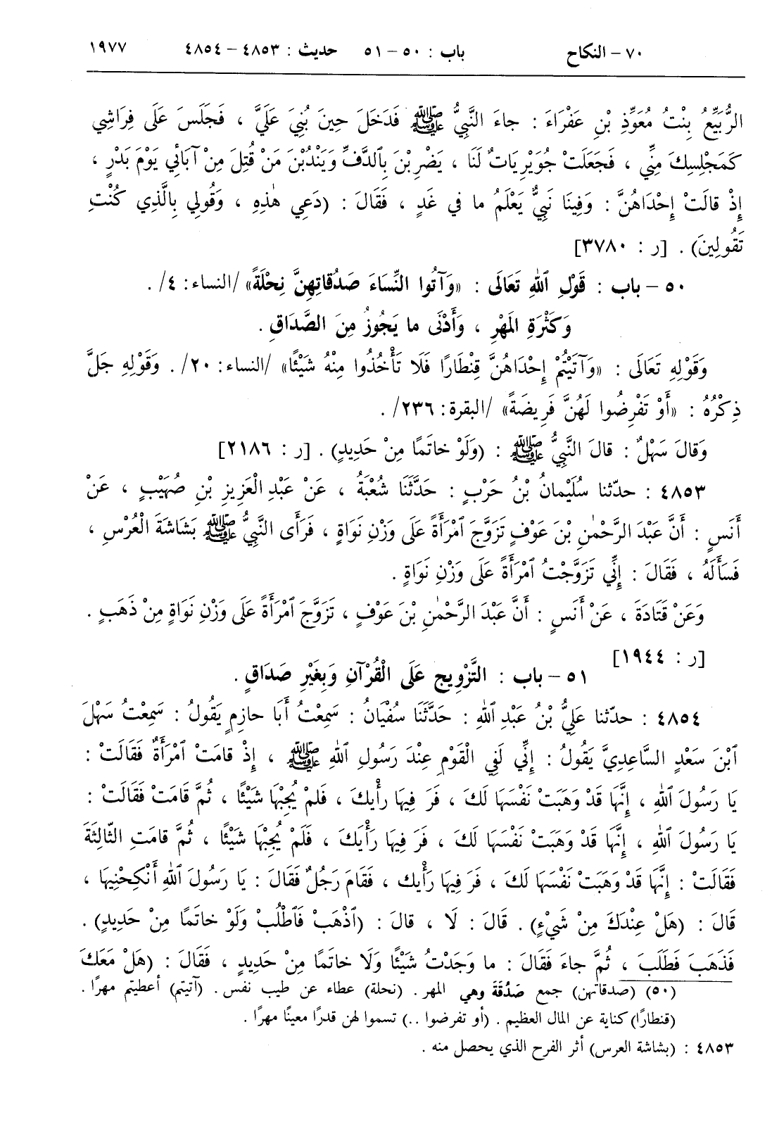 : أن عبد الرحمن بن عوف تزوج امرأة على وزن نواة فرأى النبي صلى الله عليه و سلم بشاشة العرس فسأله فقال أني تزوجت امرأة على وزن نواة