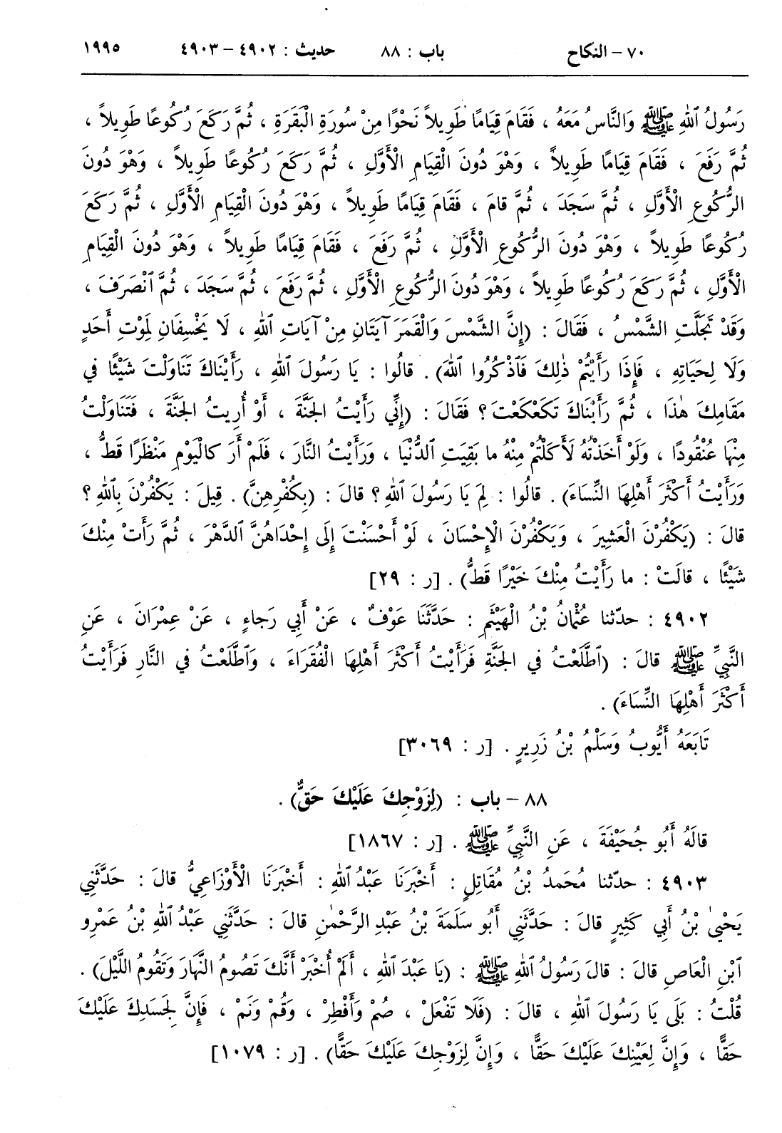 4903 - حدثنا محمد بن مقاتل أخبرنا عبد الله أخبرنا الأوزاعي قال حدثني يحيى بن أبي كثير قال حدثني أبو سلمة بن عبد الرحمن قال حدثني عبد الله بن عمرو بن العاص قال