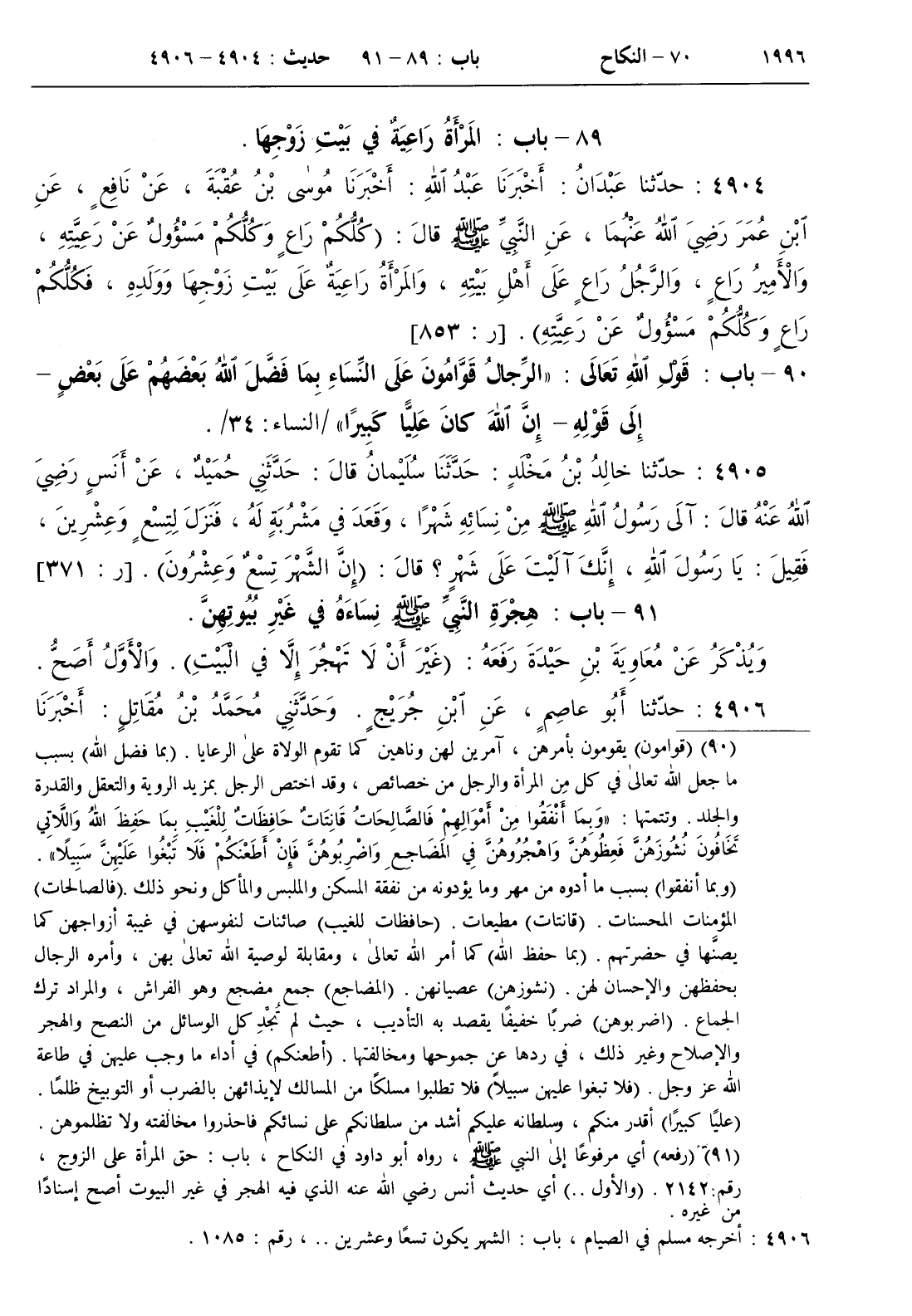 90 - باب قول الله تعالى { الرجال قوامون على النساء بما فضل الله بعضهم على بعض - إلى قوله - أن الله كان عليا كبيرا } / النساء 34 /