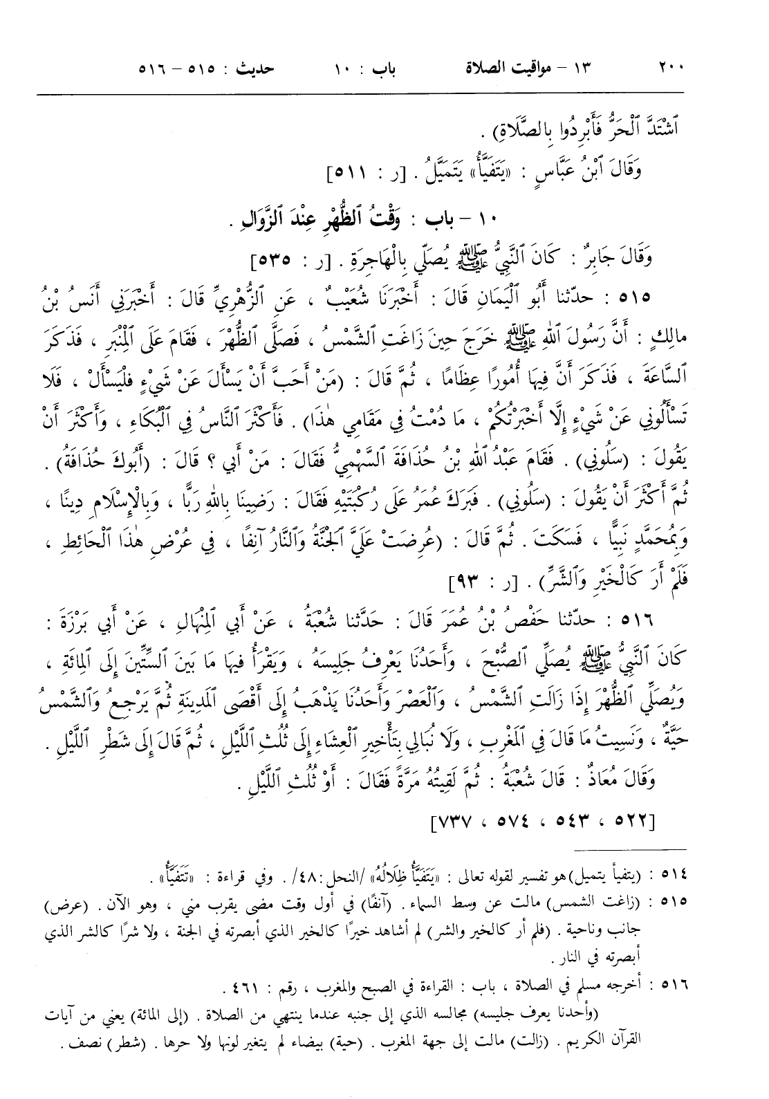 ( وأحدنا يعرف جليسه ) مجالسه الذي إلى جنبه عندما ينتهي من الصلاة . ( إلى المائة ) يعني من آيات القرآن الكريم . ( زالت ) مالت إلى جهة المغرب . ( حية ) بيضاء لم يتغير لونها ولا حرها . ( شطر ) نصف ]