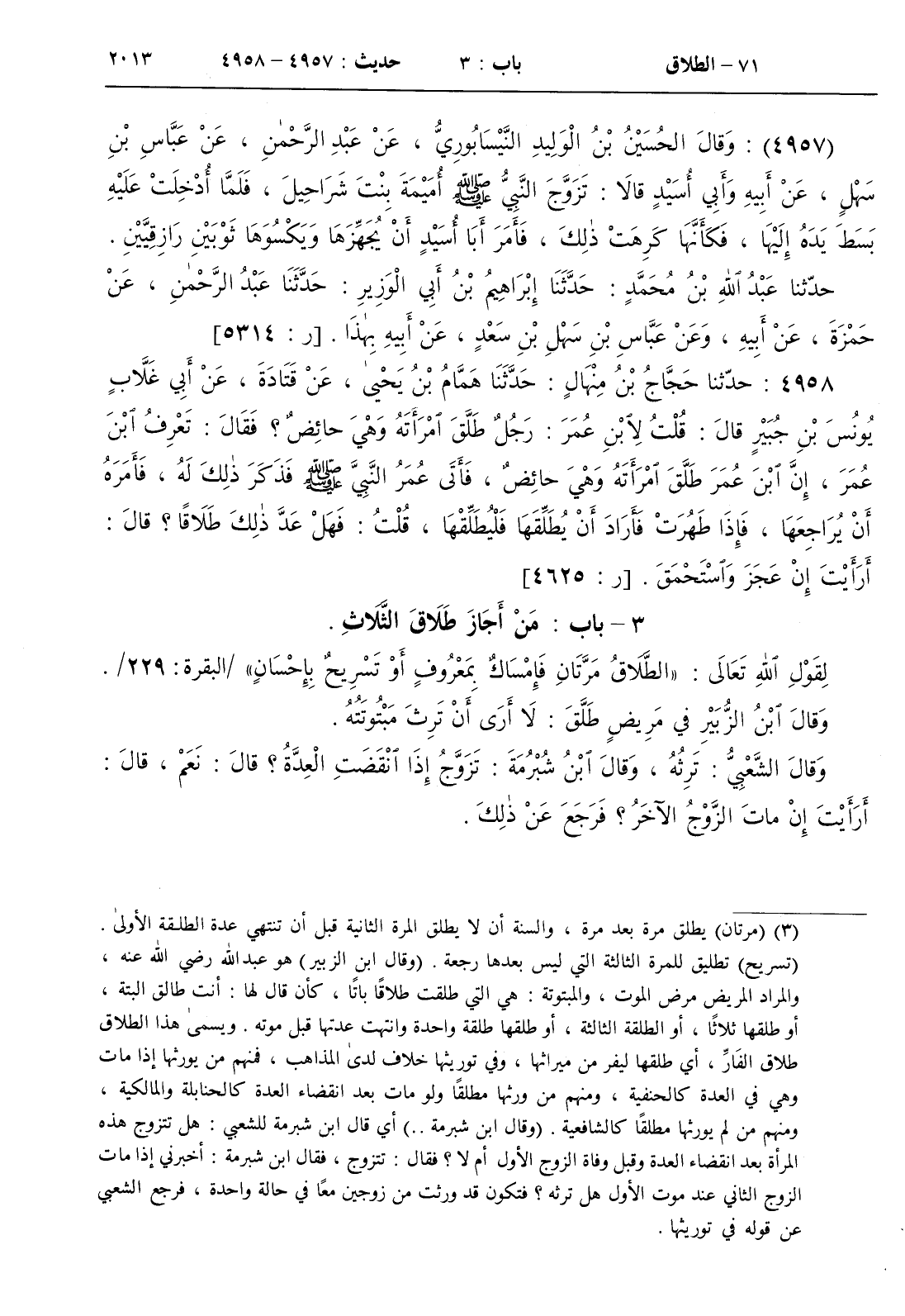 [ ش ( مرتان ) يطلق مرة بعد مرة والسنة أن لا يطلق المرة الثانية قبل أن تنتهي عدة الطلقة الأولى . ( تسريح ) تطليق للمرة الثالثة التي ليس بعدها رجعة . ( وقال ابن الزبير ) هو عبد الله رضي الله عنه والمراد المريض مرض الموت والمبتوتة هي التي طلقت طلاقا باتا كأن قال لها أنت طالق البتة أو طلقها ثلاثا أو الطلقة الثالثة أو طلقها طلقة واحدة وانتهت عدتها قبل موته ويسمى هذا الطلاق طلاق الفار أي طلقها ليفر من ميراثها وفي توريثها خلافا لدى المذاهب فمنهم من يورثها إذا مات وهي في العدة كالحنفية ومنهم من ورثها مطلقا ولو مات بعد انقضاء العدة كالحنابلة والمالكية ومنهم لم يورثها مطلقا كالشافعية ( وقال ابن شبرمة ) أي قال ابن شبرمة للشعبي هل تتزوج هذه المرأة بعد انقضاء العدة وقبل وفاة الزوج الأول أم لا ؟ فقال تتزوج فقال ابن شبرمة أخبرني إذا مات الزوج الثاني عند موت الأول هل ترثه ؟ فتكون قد ورثت من زوجين معا في حالة واحدة فرجع الشعبي عن قوله قي توريثها ]