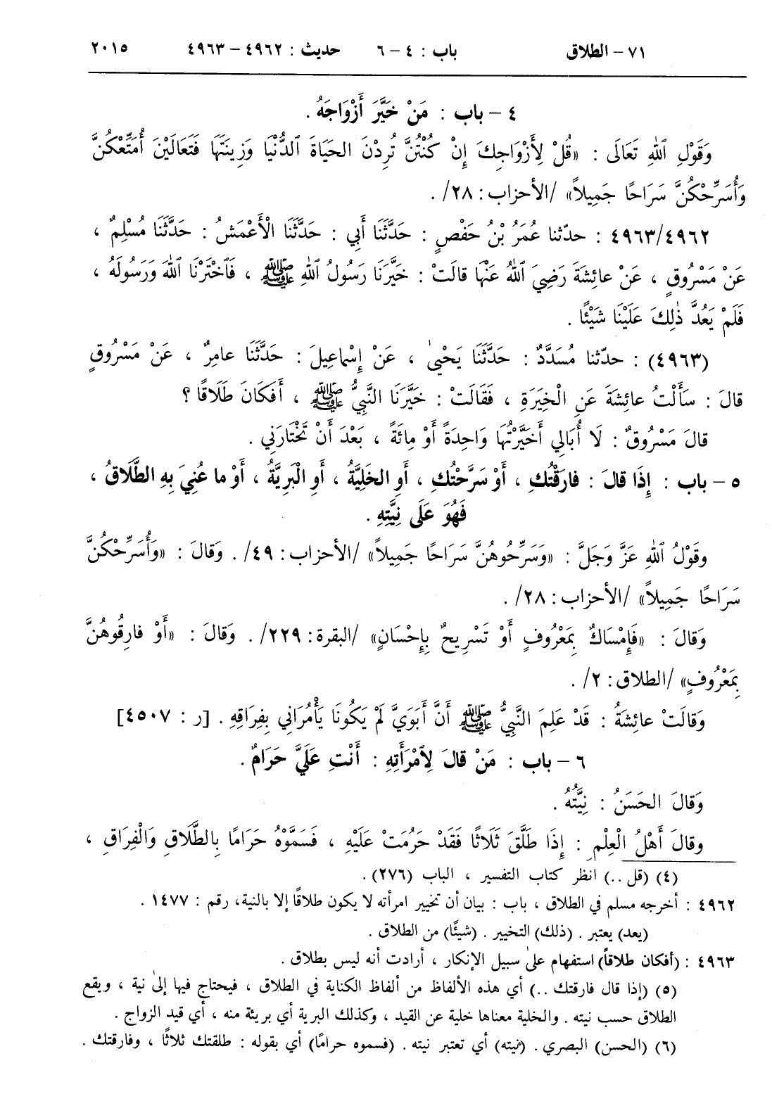 4963 - حدثنا مسدد حدثنا يحيى عن إسماعيل حدثنا عامر عن مسروق قال سألت عائشة عن الخيرة فقالت خيرنا النبي صلى الله عليه و سلم أفكان طلاقا ؟
