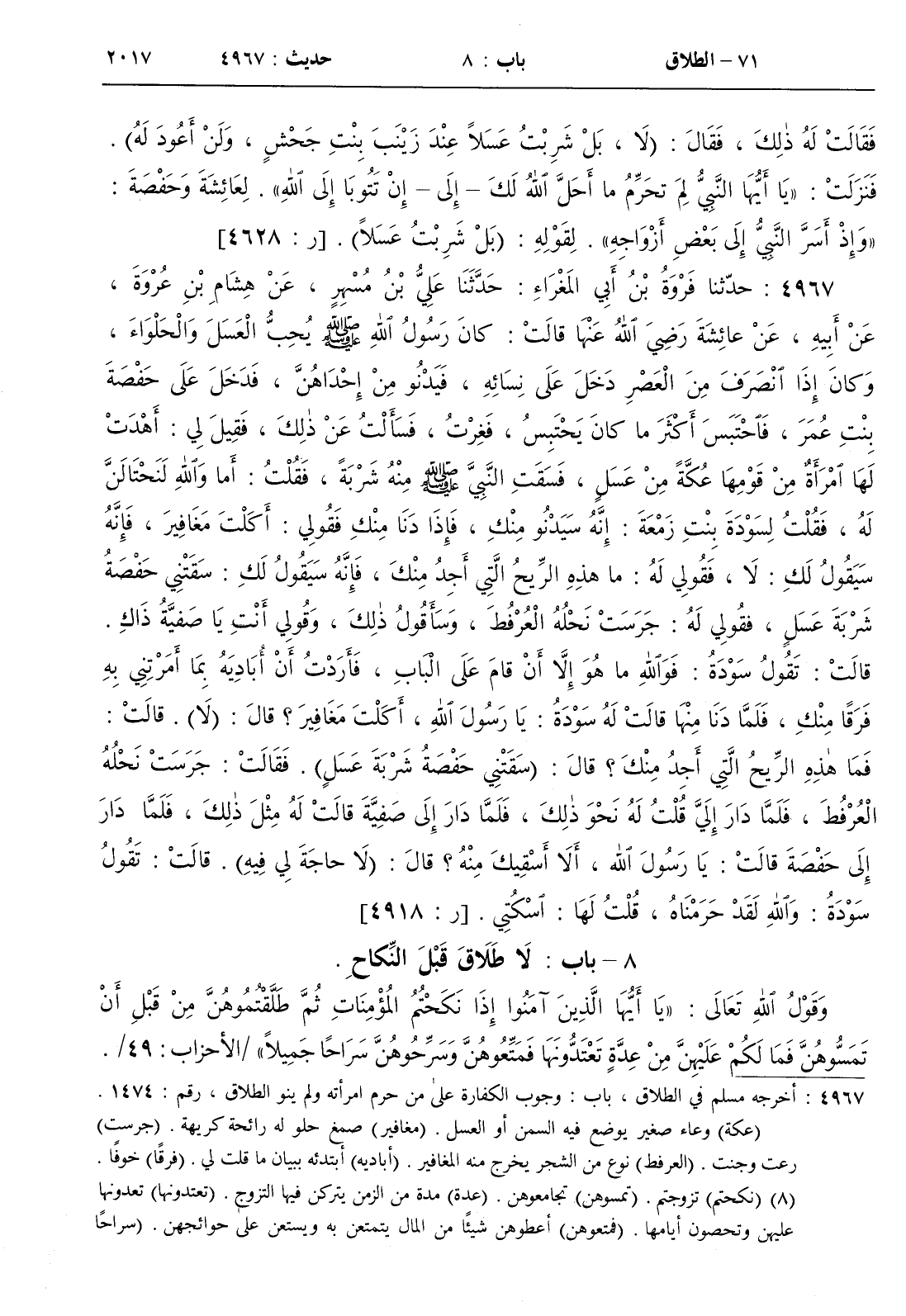 4967 - حدثنا فروة بن أبي المغراء حدثنا علي بن مسهر عن هشام بن عروة عن أبيه عن عائشة رضي الله عنها قالت كان رسول الله صلى الله عليه و سلم يحب العسل والحلواء وكان إذا انصرف من العصر دخل على نسائه فيدنو من إحداهن فدخل على حفصة بنت عمر فاحتبس أكثر ما كان يحتبس فغرت فسألت عن ذلك فقيل أهدت لها امرأة من قومها عكة من عسل فسقت النبي صلى الله عليه و سلم منه شربة فقلت أما والله لنحتالن له فقلت لسودة بنت زمعة إنه سيدنو منك فإذا دنا منك فقولي أكلت مغافير فإنه سيقول لك لا فقولي له ما هذه الريح التي أجد منك