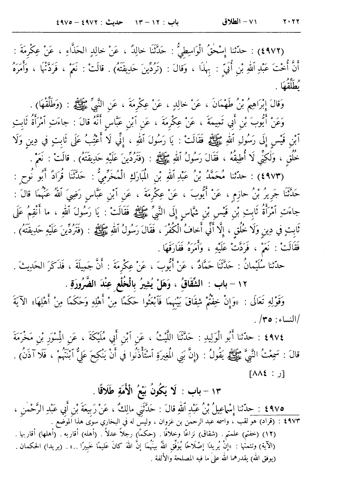 4972 - حدثنا إسحاق الواسطي حدثنا خالد عن خالد الحذاء عن عكرمة أن أخت عبد الله بن أبي بهذا وقال ( تردين حديقته ) قالت نعم فردتها وأمره يطلقها