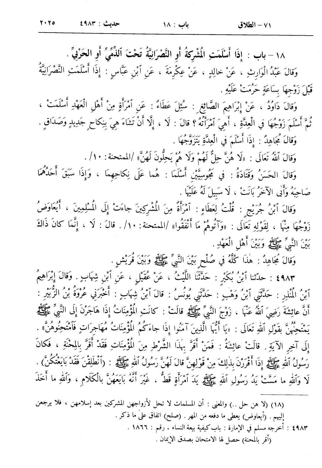 : كانت المؤمنات إذا هاجرن إلى النبي صلى الله عليه و سلم يمتحنهن بقول الله تعالى { يا أيها الذين آمنوا إذا جاءكم المؤمنات مهاجرات فامتحنوهن } إلى آخر الآية . قالت عائشة فمن اقر بهذا الشرط من المؤمنات فقد أقر بالمحنة فكان رسول الله صلى الله عليه و سلم إذا أقررن بذلك من قولهن قال لهن رسول الله صلى الله عليه و سلم ( انطلقن فقد بايعتكن ) . لا والله ما مست يد رسول الله صلى الله عليه و سلم يد امرأة قط غير أنه بايعهن بالكلام والله ما أخذ رسول الله صلى الله عليه و سلم على النساء إلا بما أمره الله يقول لهن إذا أخذ عليهن ( قد بايعتكن ) كلاما