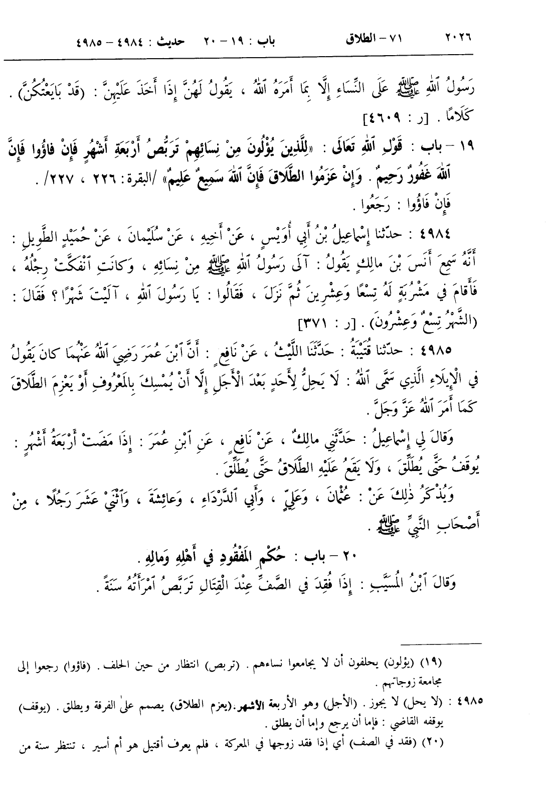 4985 - حدثنا قتيبة حدثنا الليث عن نافع أن ابن عمر رضي الله عنهما كان يقول في الإيلاء الذي سمى الله
