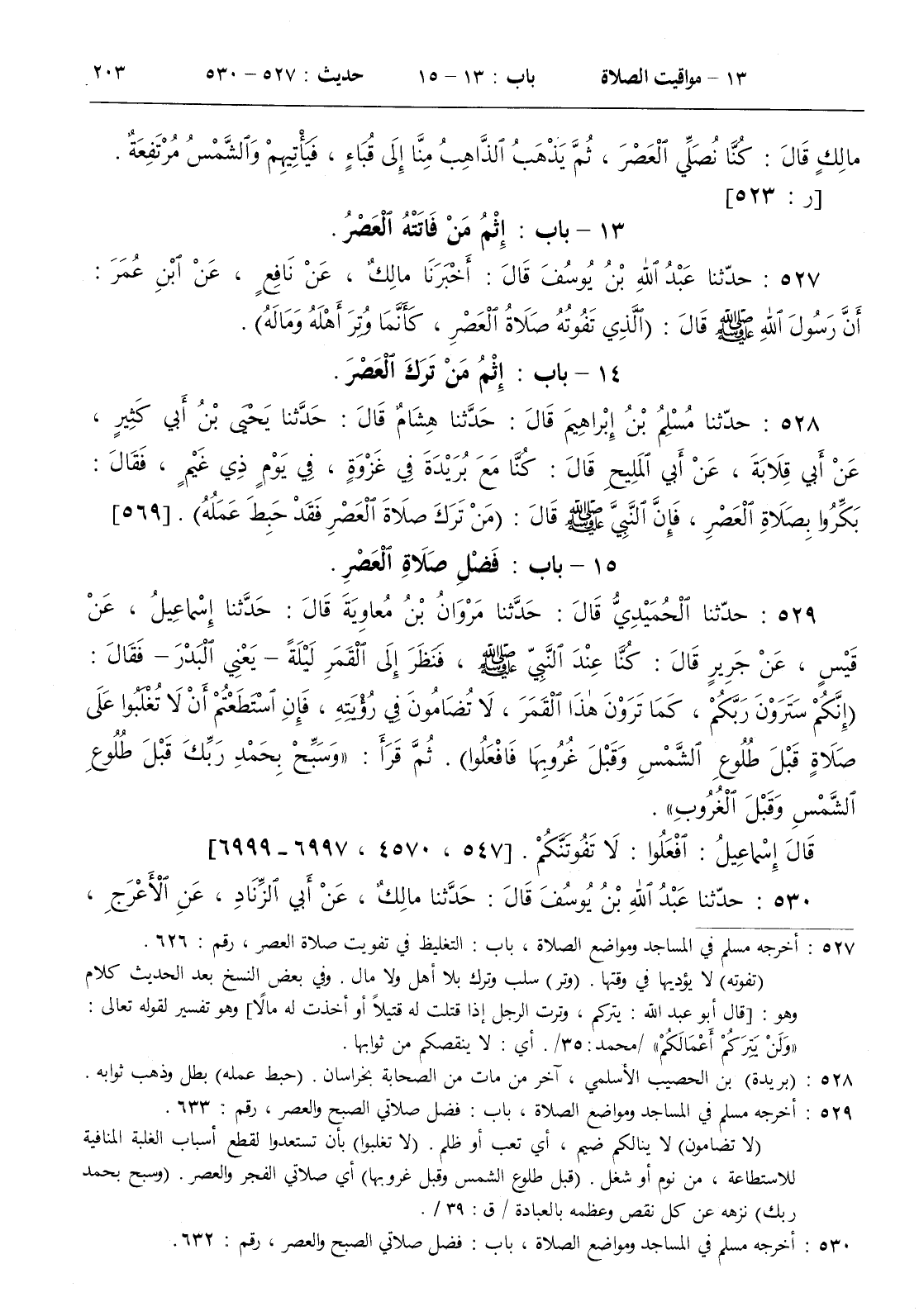 528 - حدثنا مسلم بن إبراهيم قال حدثنا هشام قال حدثنا يحيى بن أبي كثير عن أبي قلابة عن أبي المليح قال كنا مع بريدة في غزوة في يوم ذي غيم فقال بكروا بصلاة العصر فإن النبي صلى الله عليه و سلم قال : من ترك صلاة العصر فقد حبط عمله