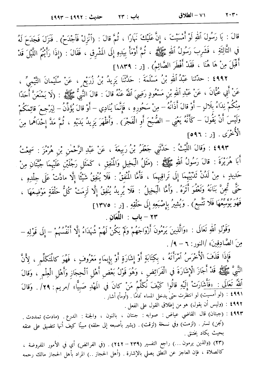 [ ش ( والذين يرمون... ) راجع التفسير ( 239 - 242 ) . ( في الفرائض ) أي في الأمور المفروضة كالصلاة فإن العاجز عن النطق يصلي بالإشارة . ( أهل الحجاز . . ) المراد بأهل الحجاز مالك رحمه الله ومن تبعه وأهل العلم أبو ثور رحمه الله تعالى . ( المهد ) هو الفراش الذي يهيأ للصبي ليضجع فيه وينام والمراد أنهم عرفوا من إشارتها ما كان يعرف من نطقها . ( وقال الضحاك ) أي ولولا أنه يفهم بالإشارة ما يفهم بالنطق لما أمره الله تعالى بذلك . ( بعض الناس . . ) المراد أبو حنيفة رحمه الله تعالى فإنه قال لا يقام بالإشارة حد ولا يعتبر اللعان . ( وقال برأسه ) أي أشار برأسه فيما يسأل عنه قبل وحماد هو ابن أبي سليمان شيخ أبي حنيفة رحمهما الله تعالى ]