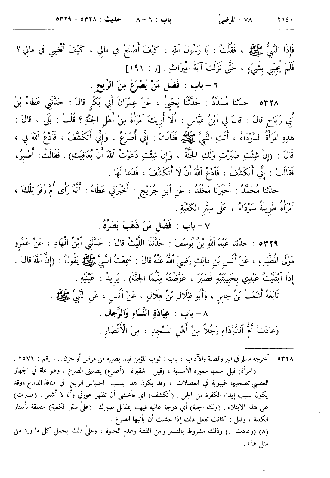 : قال لي ابن عباس ألا أريك امرأة من أهل الجنة ؟ قلت بلى قال هذه المرأة السوداء أتت النبي صلى الله عليه و سلم فقالت إني أصرع وإني أتكشف فادع الله لي قال ( إن شئت صبرت ولك الجنة وإن شئت دعوت الله أن يعافيك ) . فقالت أصبر فقالت إني أتكشف فادع الله أن لا أتكشف فدعا لها