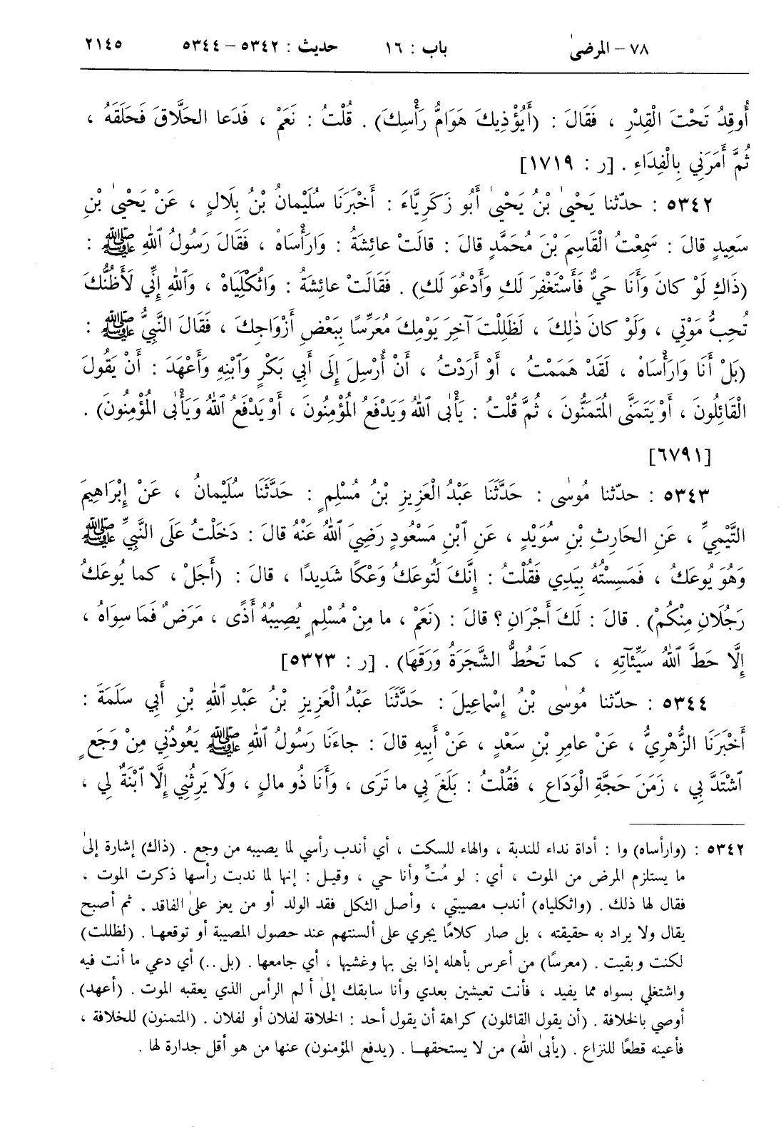 : قالت عائشة وارأساه فقال رسول الله صلى الله عليه و سلم ( ذاك لو كان وأنا حي فأستغفر لك وأدعو لك ) . فقالت عائشة واثكلياه والله إني لأظنك تحب موتي ولو كان ذلك لظللت آخر يومك معرسا ببعض أزواجك فقال النبي صلى الله عليه و سلم ( بل أنا وارأساه لقد هممت أو أردت أن أرسل إلى أبي بكر وابنه وأعهد أن يقول القائلون أو يتمنى المتمنون ثم قلت يأبى الله ويدفع المؤمنون أو يدفع الله ويأبى المؤمنون )