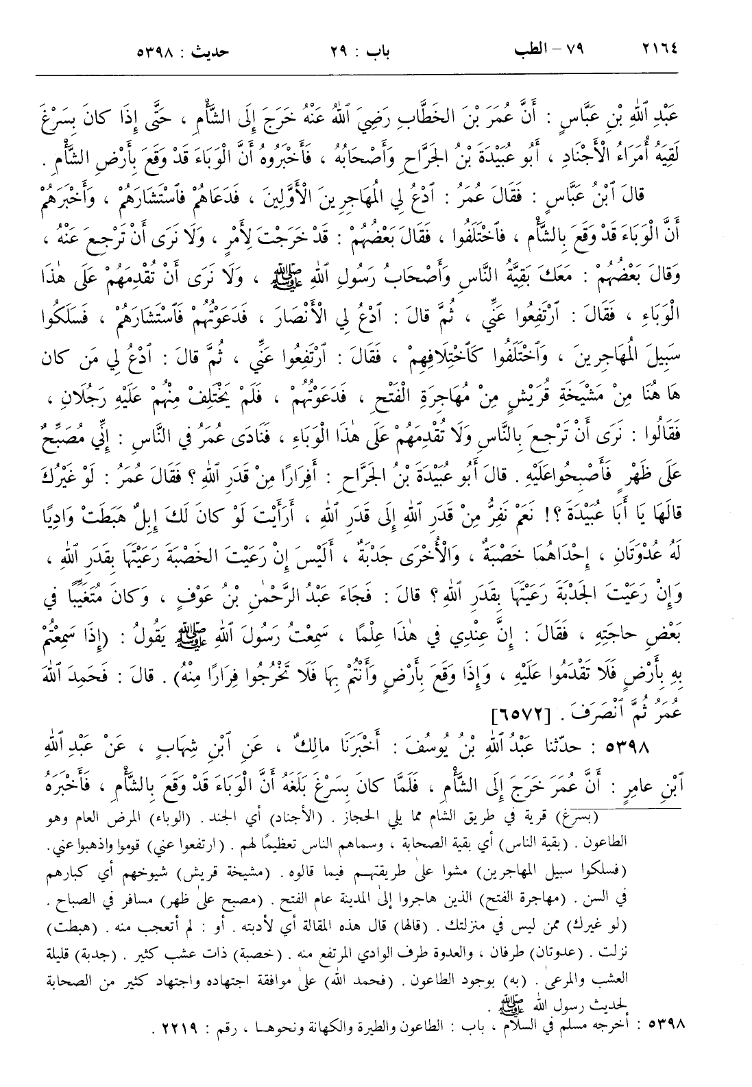 : أن عمر خرج إلى الشأم فلما كان بسرغ بلغه أن الوباء قد وقع بالشأم فأخبره عبد الرحمن بن عوف أن رسول الله صلى الله عليه و سلم قال ( إذا سمعتم به بأرض فلا تقدموا عليه وإذا وقع بأرض وأنتم بها فلا تخرجوا فرارا منه )