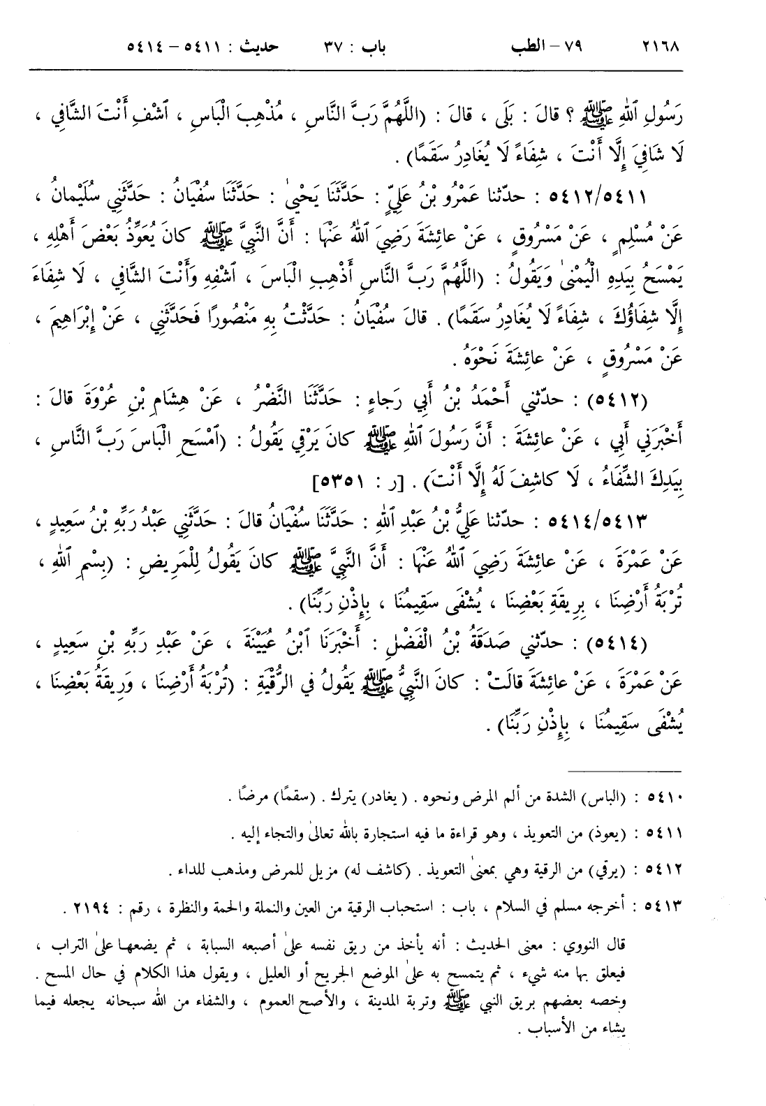 : أن النبي صلى الله عليه و سلم كان يعوذ بعض أهله يمسح بيده اليمنى ويقول ( اللهم رب الناس أذهب الباس اشفه وأنت الشافي لا شفاء إلا شفاؤك شفاء لا يغادر سقما )