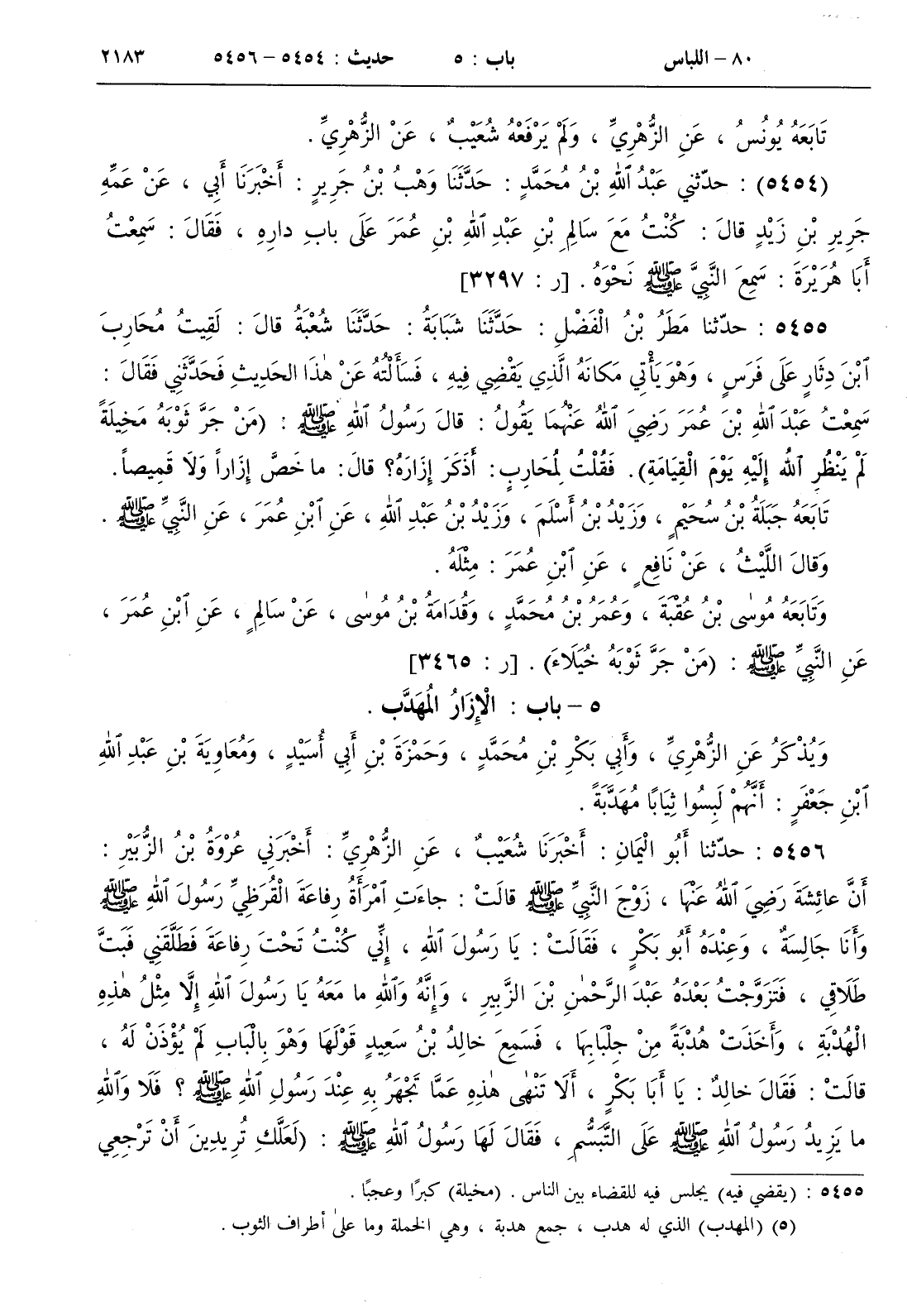 : قال رسول الله صلى الله عليه و سلم ( من جر ثوبه مخيلة لم ينظر الله إليه يوم القيامة ) . فقلت لمحارب أذكر إزاره ؟ قال ما خص إزاره ولا قميصا . تابعه جبلة بن سحيم وزيد بن أسلم وزيد بن عبد الله عن ابن عمر عن النبي صلى الله عليه و سلم . وقال الليث عن نافع عن ابن عمر مثله . وتابعه موسى بن عقبة وعمر بن محمد وقدامة بن موسى عن سالم عن ابن عمر عن النبي صلى الله عليه و سلم ( من جر ثوبه خيلاء )
