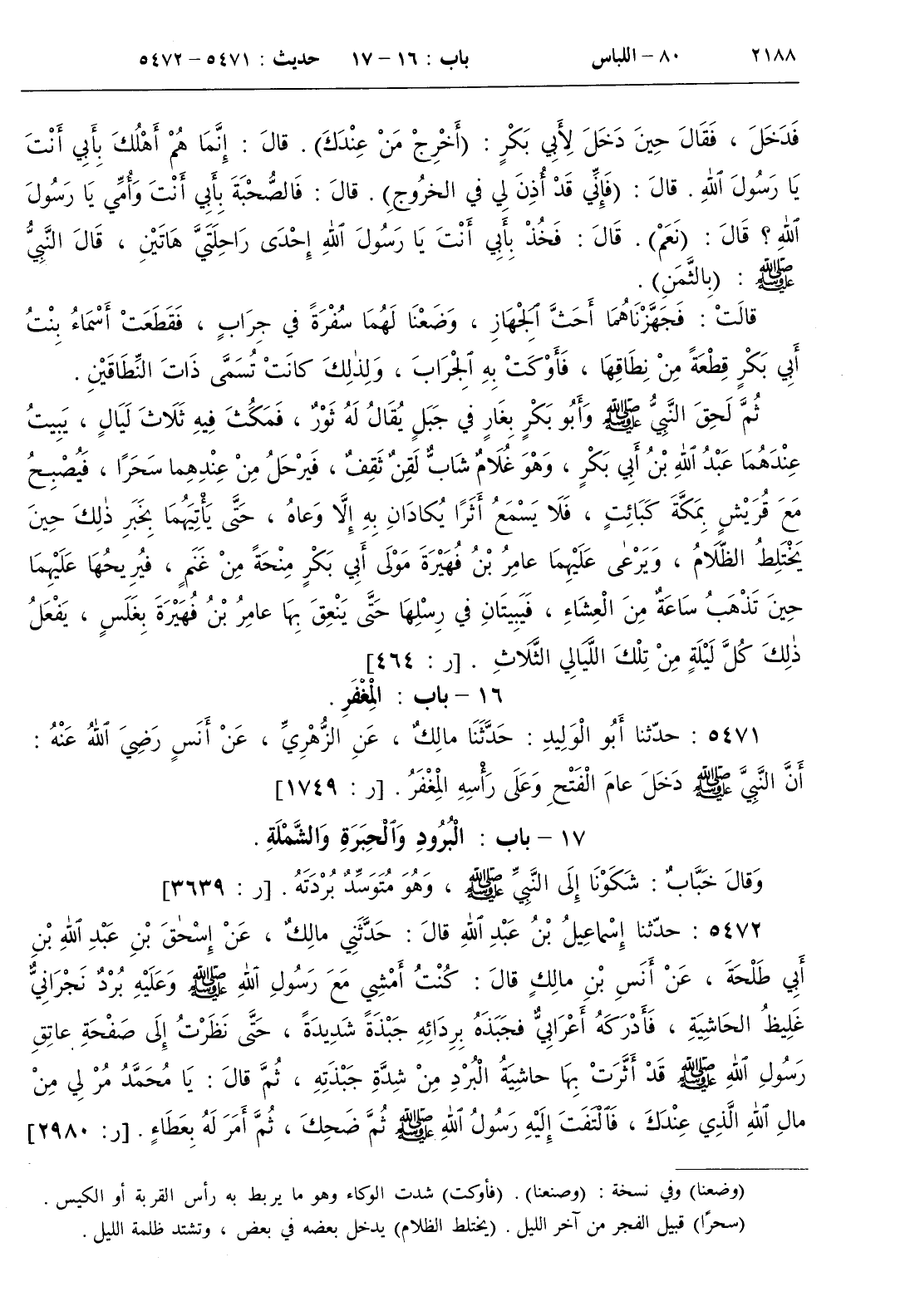 : كنت أمشي مع رسول الله صلى الله عليه و سلم وعليه برد نجراني غليظ الحاشية فأدركه أعرابي فجبذه بردائه جبذة شديدة حتى نظرت إلى صفحة عاتق رسول الله صلى الله عليه و سلم قد أثرت بها حاشية البرد من شدة جبذته ثم قال يا محمد مر لي من مال الله الذي عندك فالتفت إليه رسول الله صلى الله عليه و سلم ثم ضحك ثم أمر له بعطاء