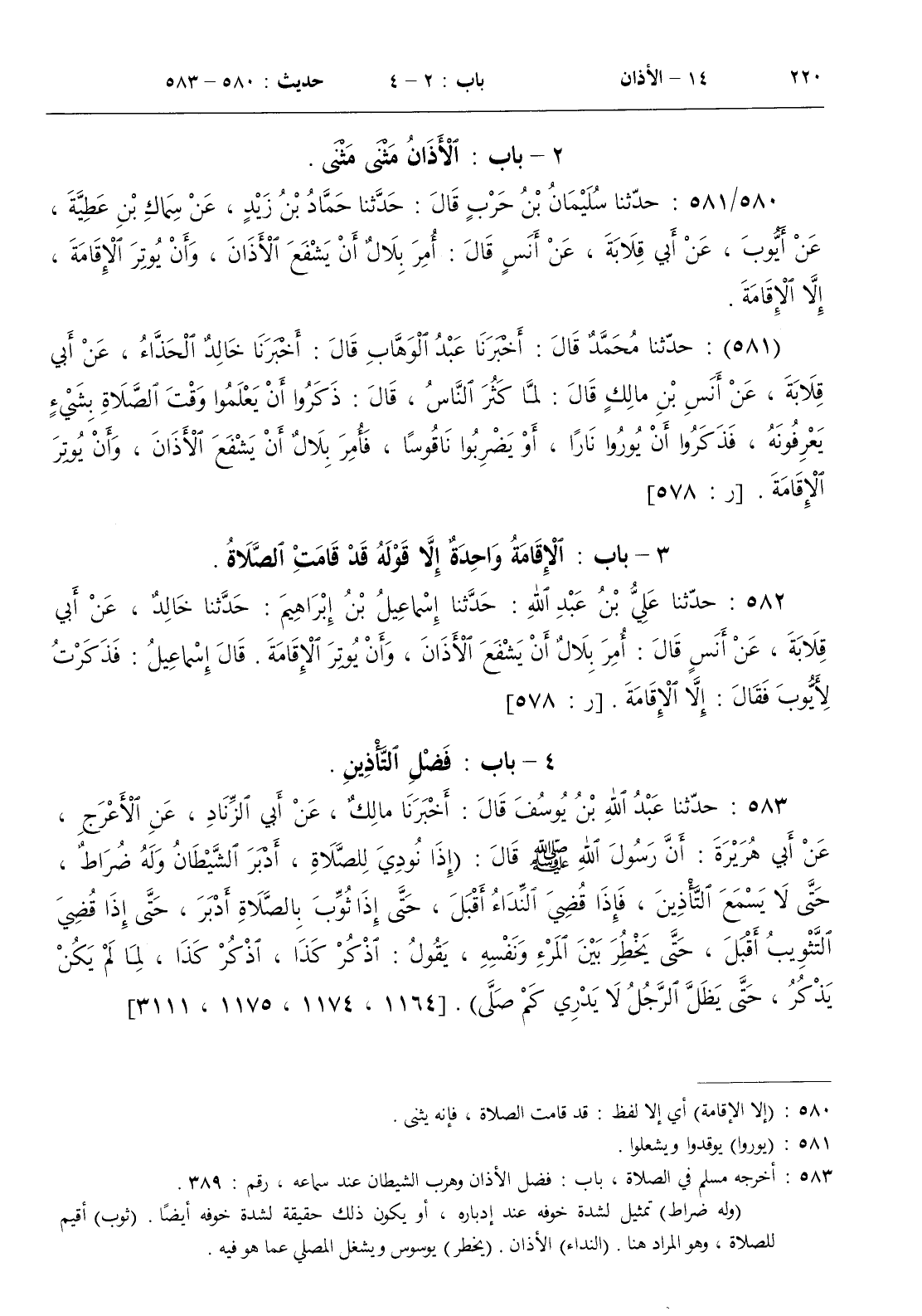 580 - حدثنا سليمان بن حرب قال حدثنا حماد بن زيد عن سماك بن عطية عن أيوب عن أبي قلابة عن أنس قال أمر بلال أن يشفع الأذان وأن يوتر الإقامة إلا الإقامة
