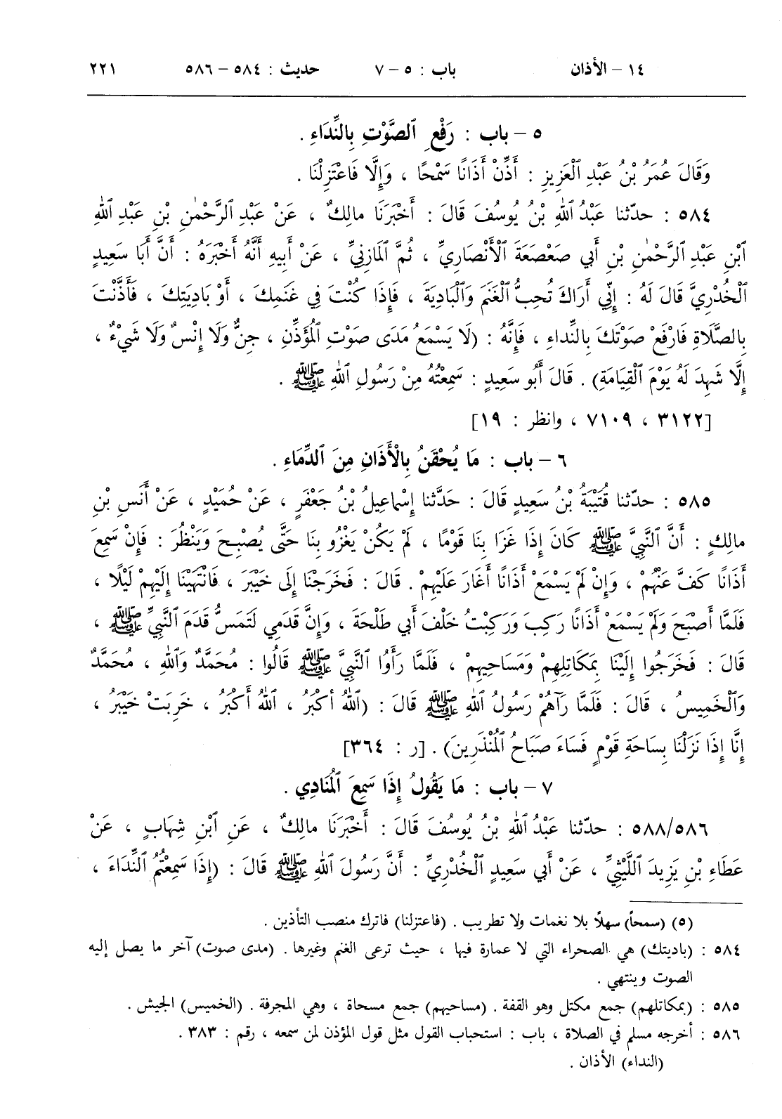 584 - حدثنا عبد الله بن يوسف قال أخبرنا مالك عن عبد الرحمن بن عبد الله بن عبد الرحمن بن أبي صعصعة الأنصاري ثم المازني عن أبيه أنه أخبره أن أبا سعيد الخدري قال له إني أراك الغنم والبادية فإذا كنت في غنمك أو باديتك فأذنت بالصلاة فارفع صوتك بالنداء فإنه ( لا يسمع مدى صوت المؤذن جن ولا إنس ولا شيء إلا شهد له يوم القيامة )