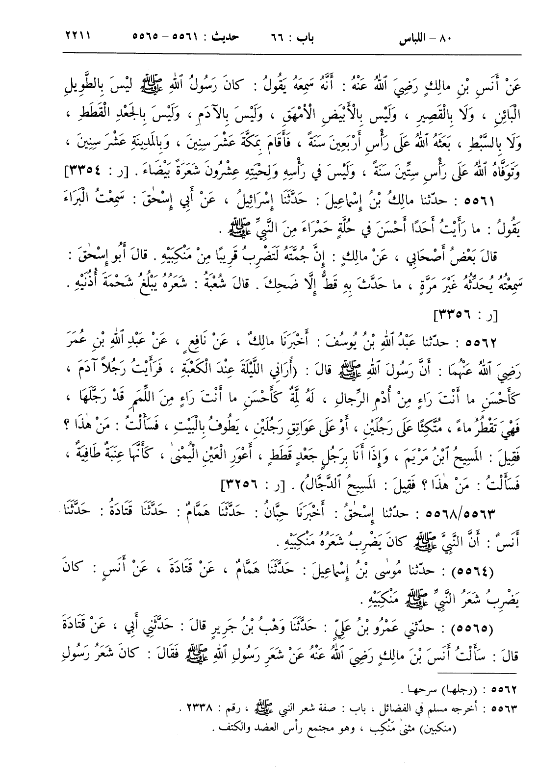 : سألت أنس بن مالك رضي الله عنه عن شعر رسول الله صلى الله عليه و سلم فقال كان شعر رسول الله صلى الله عليه و سلم رجلا ليس بالسبط ولا الجعد بين أذنيه وعاتقه