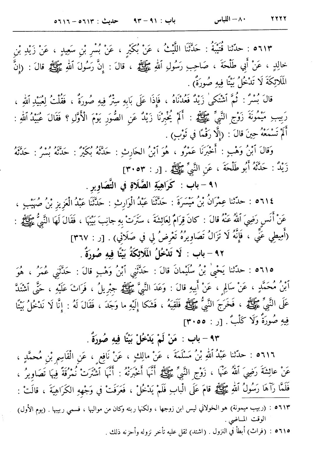 قال بسر ثم اشتكى زيد فعدناه فإذا على بابه ستر فيه صورة فقلت لعبيد الله ربيب ميمونة زوج النبي صلى الله عليه و سلم ألم يخبرنا زيد عن الصور يوم الأول ؟ فقال عبيد الله ألم تسمعه حين قال ( إلا رقما في ثوب )