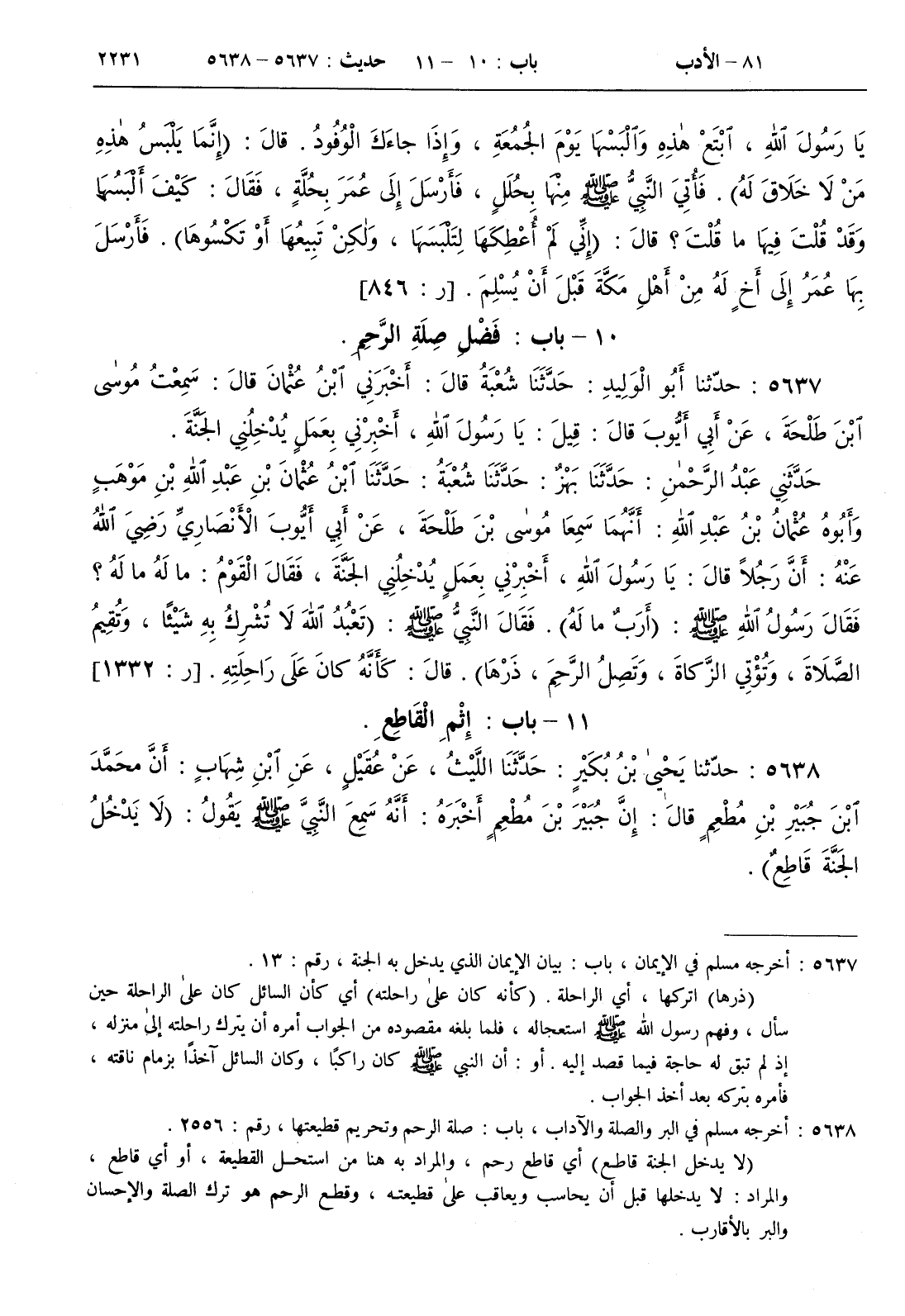 5637 - حدثنا أبو الوليد حدثنا شعبة قال أخبرني ابن عثمان قال سمعت موسى بن طلحة عن أبي أيوب قال قيل يا رسول الله أخبرني بعمل يدخلني الجنة