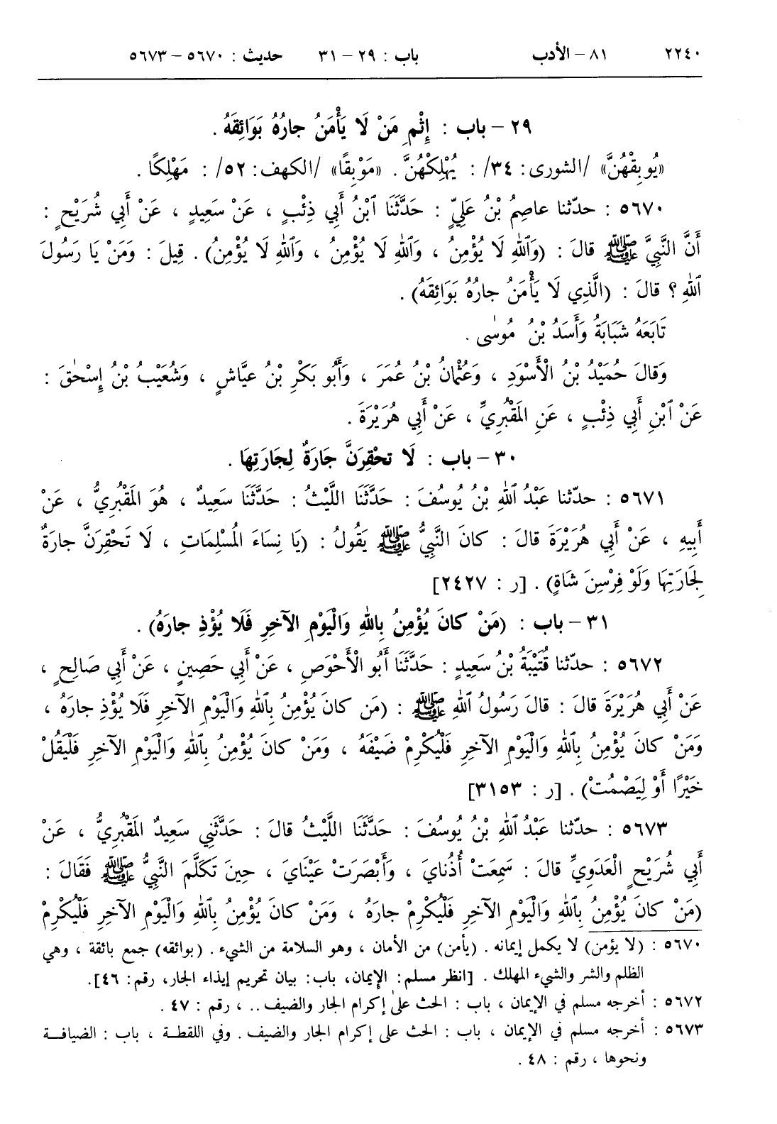 31 - باب ( من كان يؤمن بالله واليوم الآخر فلا يؤذ جاره )