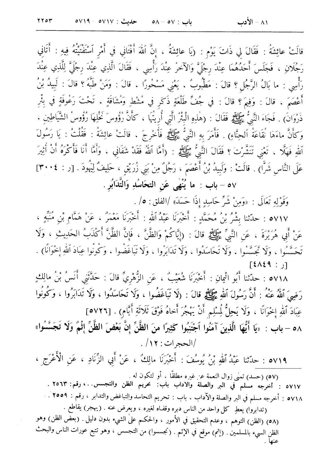 58 - باب { يا أيها الذين آمنوا اجتنبوا كثيرا من الظن إن بعض الظن إثم ولا تجسسوا } / الحجرات 12 /