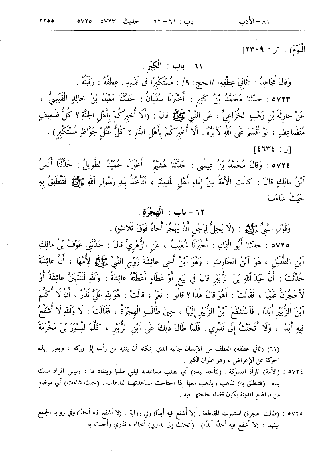 : أن عبد الله بن الزبير قال في بيع أو عطاء أعطته عائشة والله لتنتهين عائشة أو لأحجرن عليها فقالت أهو قال هذا ؟ قالوا نعم قالت هو لله علي نذر أن لا أكلم ابن الزبير أبدا . فاستشفع ابن الزبير إليها حين طالت الهجرة فقالت لا والله لا أشفع فيه أبدا ولا أتحنث إلى نذري . فلما طال ذلك على ابن الزبير كلم المسور بن مخرمة وعبد الرحمن بن الأسود بن عبد يغوث وهما من بني زهرة وقال لهما أنشدكما بالله لما أدخلتماني على عائشة فإنها لا يحل لها أن تنذر قطيعتي . فأقبل به المسور وعبد الرحمن مشتملين بأرديتهما حتى استأذنا على عائشة فقالا السلام عليك ورحمة الله وبركاته أندخل ؟ قالت عائشة ادخلوا قالوا كلنا ؟ قالت نعم ادخلوا كلكم ولا تعلم أن معهما ابن الزبير فلما دخلوا دخل ابن الزبير الحجاب فاعتنق عائشة وطفق يناشدها ويبكي وطفق المسور وعبد الرحمن يناشدانها إلا ما كلمته وقبلت منه ويقولان إن النبي صلى الله عليه و سلم نهى عما قد علمت من الهجرة فإنه ( لا يحل لمسلم أن يهجر أخاه فوق ثلاث ليال ) . فلما أكثروا على عائشة من التذكرة والتحريج طفقت تذكرهما وتبكي وتقول إني نذرت والنذر شديد فلم يزالا بها حتى كلمت ابن الزبير وأعتقت في نذرها ذلك أربعين رقبة وكانت تذكر نذرها بعد ذلك فتبكي حتى تبل دموعها خمارها