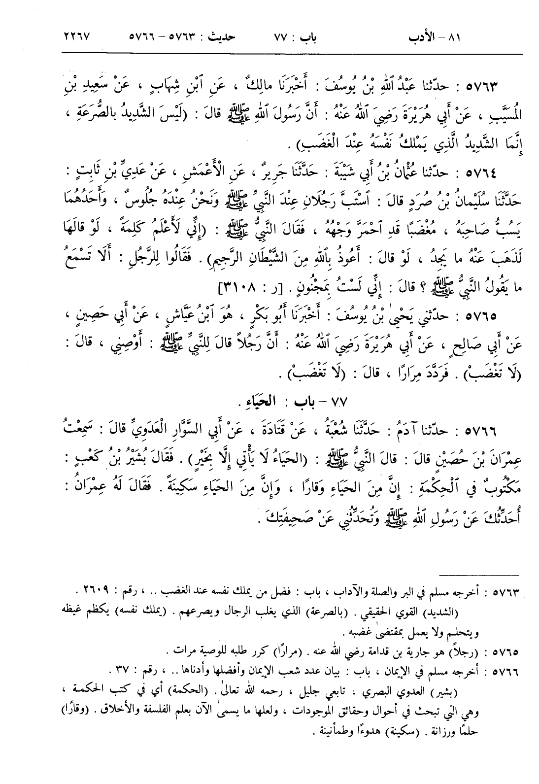 : قال النبي صلى الله عليه و سلم ( الحياء لا يأتي إلا بخير ) . فقال بشير بن كعب مكتوب في الحكمة إن من الحياء وقارا وإن من الحياء سكينة . فقال له عمران أحدثك عن رسول الله صلى الله عليه و سلم وتحدثني عن صحيفتك