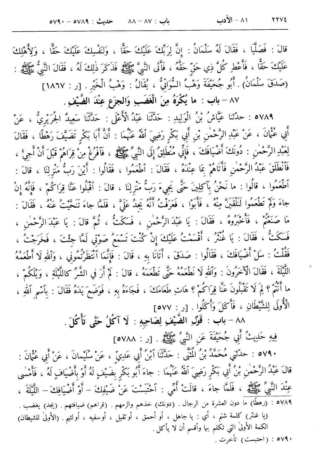 : أن أبا بكر تضيف رهطا فقال لعبد الرحمن دونك أضيافك فإني منطلق إلى النبي صلى الله عليه و سلم فأفرغ من قراهم قبل أن أجيء فانطلق عبد الرحمن فأتاهم بما عنده فقال اطعموا فقالوا أين رب منزلنا قال اطعموا قالوا ما نحن بآكلين حتى يجيء رب منزلنا قال اقبلوا عنا قراكم فإنه إن جاء ولم تطعموا لنلقين منه فأبوا فعرفت أنه يجد علي فلما جاء تنحيت عنه فقال ما صنعتم فأخبروه فقال يا عبد الرحمن فسكت ثم قال يا عبد الرحمن فسكت فقال يا غنثر أقسمت عليك إن كنت تسمع صوتي لما جئت فخرجت فقلت سل أضيافك فقالوا صدق أتانا به قال فإنما انتظرتموني والله لا أطعمه الليلة فقال الآخرون والله لا نطعمه حتى تطعمه قال لم أر في الشر كالليلة ويلكم ما أنتم ؟ لم لا تقبلون عنا قراكم ؟ هات طعامك فجاءه به فوضع يده فقال باسم الله الأولى للشيطان فأكل وأكلوا