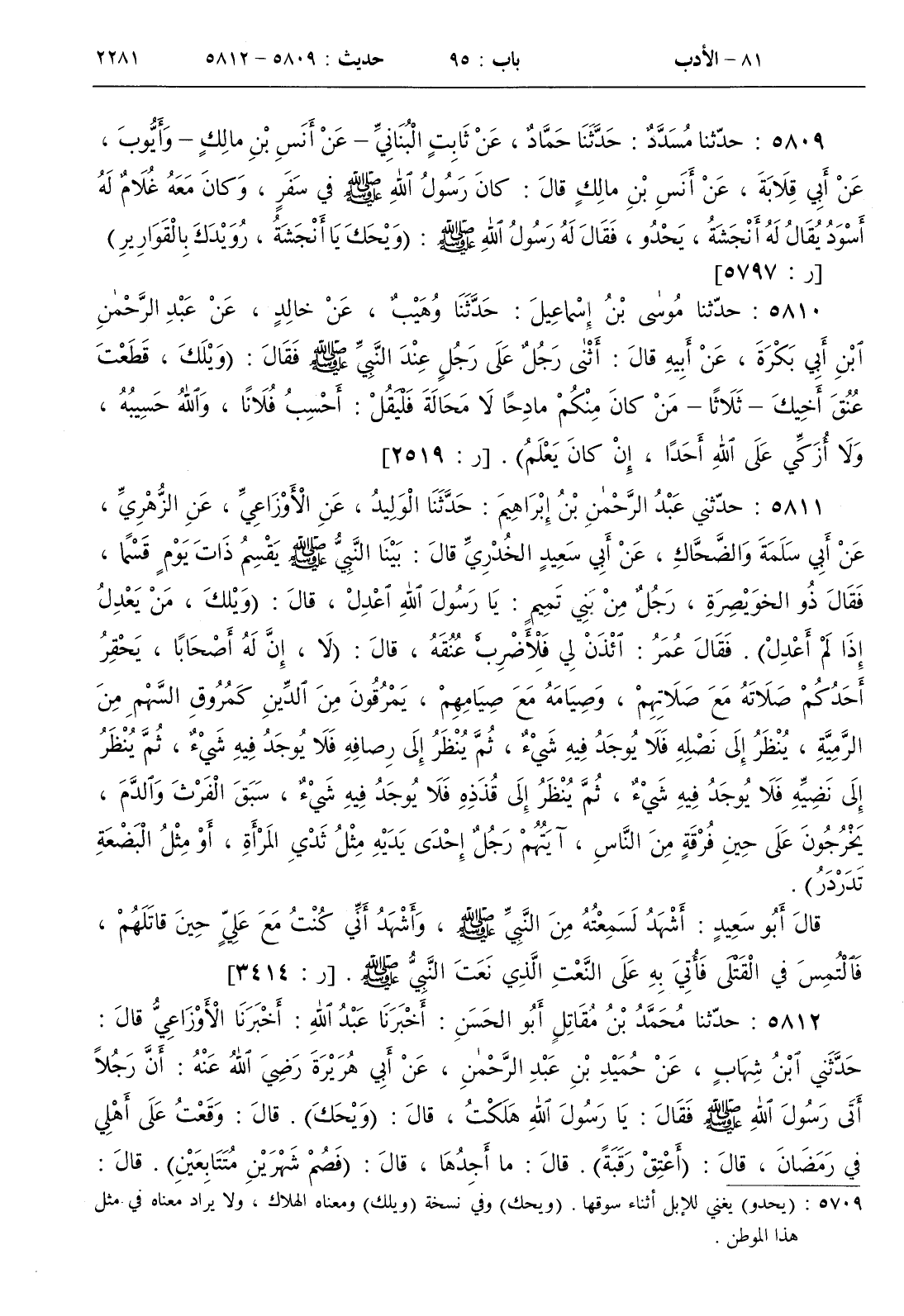 5809 - حدثنا مسدد حدثنا حماد عن ثابت البناني عن أنس بن مالك . وأيوب عن أبي قلابة عن أنس بن مالك قال