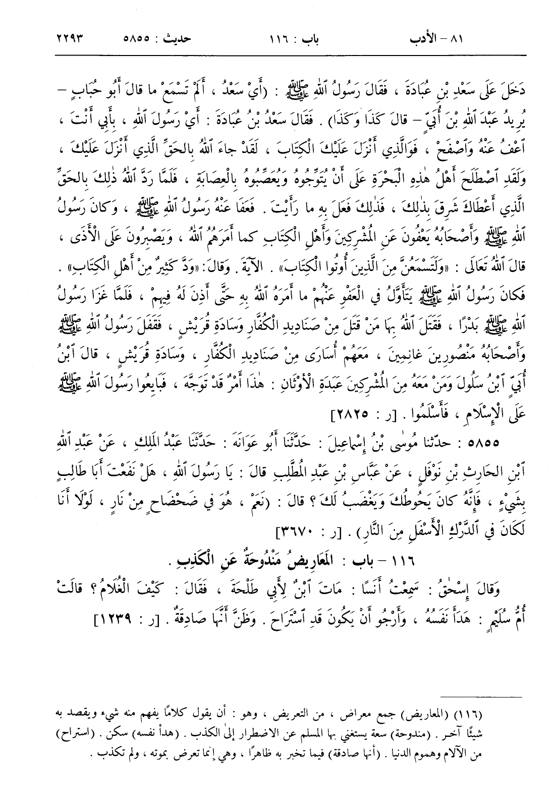[ ش ( المعاريض ) جمع معراض من التعريض وهو أن يقول كلاما يفهم منه شيء ويقصد به شيئا آخر . ( مندوحة ) سعة يستغني بها المسلم عن الاضطرار إلى الكذب . ( هدأ نفسه ) سكن . ( استراح ) من الآلام وهموم الدنيا