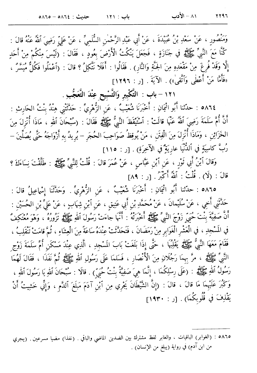 5865 - حدثنا أبو اليمان أخبرنا شعيب عن الزهري . وحدثنا إسماعيل قال حدثني أخي عن سليمان عن محمد بن أبي عتيق عن ابن شهاب عن علي بن الحسين أن صفية بنت حيي زوج النبي صلى الله عليه و سلم أخبرته