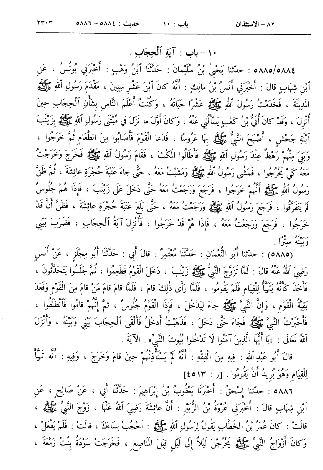 : أنه كان ابن عشر سنين مقدم رسول الله صلى الله عليه و سلم المدينة فخدمت رسول الله صلى الله عليه و سلم عشرا حياته وكنت أعلم الناس بشأن الحجاب حين أنزل وقد كان أبي بن كعب يسألني عنه وكان أول ما نزل في مبتنى رسول الله صلى الله عليه و سلم بزينب ابنة جحش أصبح النبي صلى الله عليه و سلم بها عروسا فدعا القوم فأصابوا من الطعام ثم خرجوا وبقي منهم رهط عند رسول الله صلى الله عليه و سلم فأطالوا المكث فقام رسول الله صلى الله عليه و سلم فخرج وخرجت معه كي يخرجوا فمشى رسول الله صلى الله عليه و سلم ومشيت معه حتى جاء عتبة حجرة عائشة ثم ظن رسول الله صلى الله عليه و سلم أنهم خرجوا فرجع ورجعت معه حتى دخل على زينب فإذا هم جلوس لم يتفرقوا فرجع رسول الله صلى الله عليه و سلم ورجعت معه حتى بلغ عتبة حجرة عائشة فظن أن قد خرجوا فرجع ورجعت معه فإذا هم قد خرجوا فأنزل آية الحجاب فضرب بيني وبينه سترا