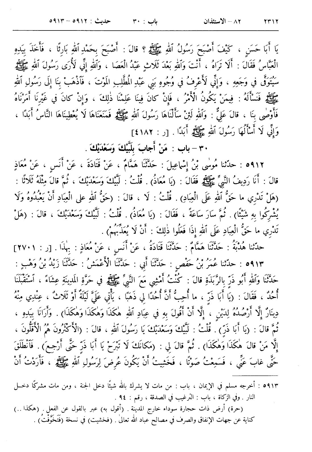 : كنت أمشي مع النبي صلى الله عليه و سلم في حرة المدينة عشاء استقبلنا أحد فقال ( يا أبا ذر ما أحب أن أحدا لي ذهبا يأتي علي ليلة أو ثلاث عندي منه دينار إلا أرصدة لدين إلا أن أقول به في عباد الله هكذا وهكذا وهكذا ) . وأرانا بيده ثم قال ( يا أبا ذر ) . قلت لبيك وسعديك يا رسول الله قال ( الأكثرون هم الأقلون إلا من قال هكذا وهكذا ) . ثم قال لي ( مكانك لا تبرح يا أبا ذر حتى أرجع ) . فانطلق حتى غاب عني فسمعت صوتا فخشيت أن يكون عرض لرسول الله صلى الله عليه و سلم فأردت أن أذهب ثم ذكرت قول رسول الله صلى الله عليه و سلم ( لا تبرح ) . فمكثت قلت يا رسول الله سمعت صوتا خشيت أن يكون عرض لك ثم ذكرت قولك فقمت فقال النبي صلى الله عليه و سلم ( ذاك جبريل أتاني فأخبرني أنه من مات من أمتي لا يشرك بالله شيئا دخل الجنة ) . قلت يا رسول الله وإن زنى وإن سرق قال ( وإن زنى وإن سرق ) . قلت لزيد إنه بلغني أنه أبو الدرداء فقال أشهد لحدثنيه أبو ذر بالربذة