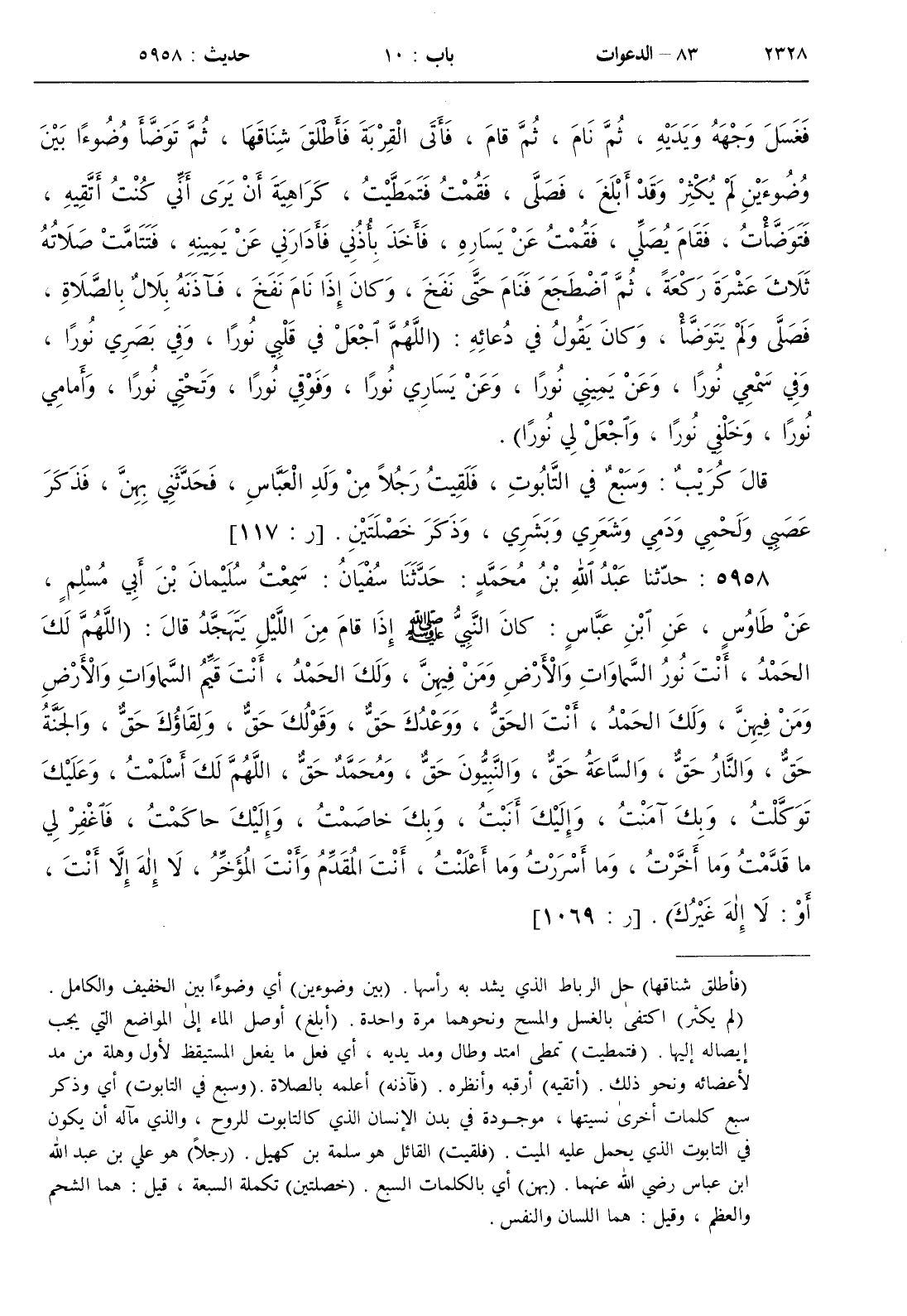 : كان النبي صلى الله عليه و سلم إذا قام من الليل يتهجد قال ( اللهم لك الحمد أنت نور السموات والأرض ومن فيهن ولك الحمد أنت قيم السموات والأرض ومن فيهن ولك الحمد أنت الحق ووعدك حق وقولك حق ولقاؤك حق والجنة حق والنار حق والساعة حق والنبيون حق ومحمد حق اللهم لك أسلمت وعليك توكلت وبك آمنت وإليك أنبت وبك خاصمت وإليك حاكمت فاغفر لي ما قدمت وما أخرت وما أسررت وما أعلنت أنت المقدم وأنت المؤخر لا إله إلا أنت أو لا إله غيرك )