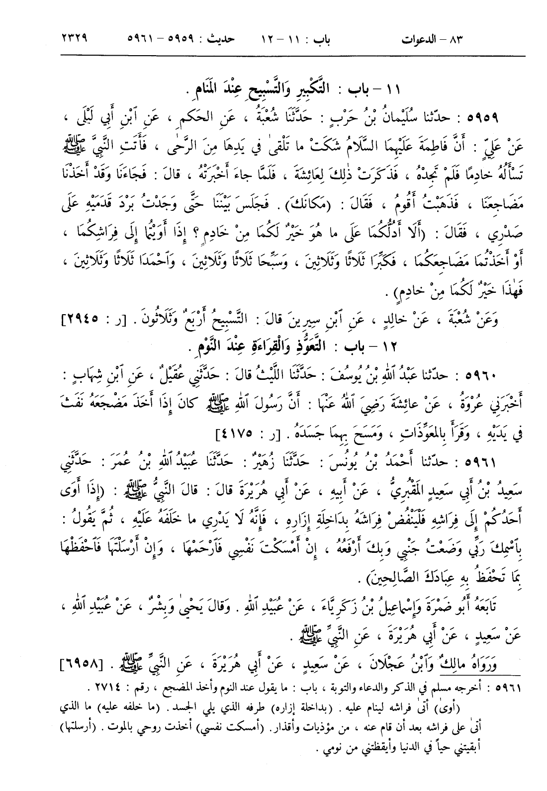 : أن فاطمة عليهما السلام شكت ما تلقى في يدها من الرحى فأتت النبي صلى الله عليه و سلم تسأله خادما فلم تجده فذكرت ذلك لعائشة فلما جاء أخبرته قال فجاءنا وقد أخذنا مضاجعنا فذهبت أقوم فقال ( مكانك ) . فجلس بيننا حتى وجدت برد قدميه على صدري فقال ( ألا أدلكما على ما هو خير لكما من خادم ؟ إذا أويتما إلى فراشكما أو أخذتما مضاجعكما فكبرا ثلاثا وثلاثين وسبحا ثلاثا وثلاثين واحمدا ثلاثا وثلاثين فهذا خير لكما من خادم )