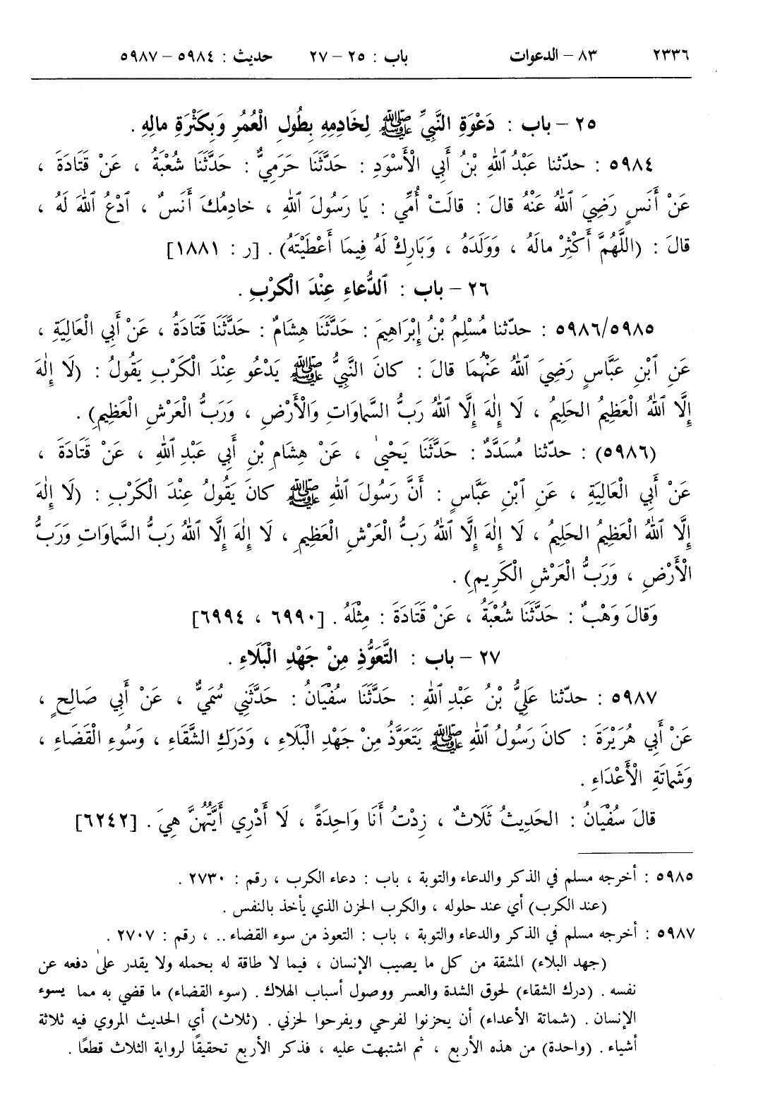 : كان النبي صلى الله عليه و سلم يدعو عند الكرب يقول ( لا إله إلا الله العظيم الحليم لا إله إلا الله رب السموات والأرض ورب العرش العظيم )