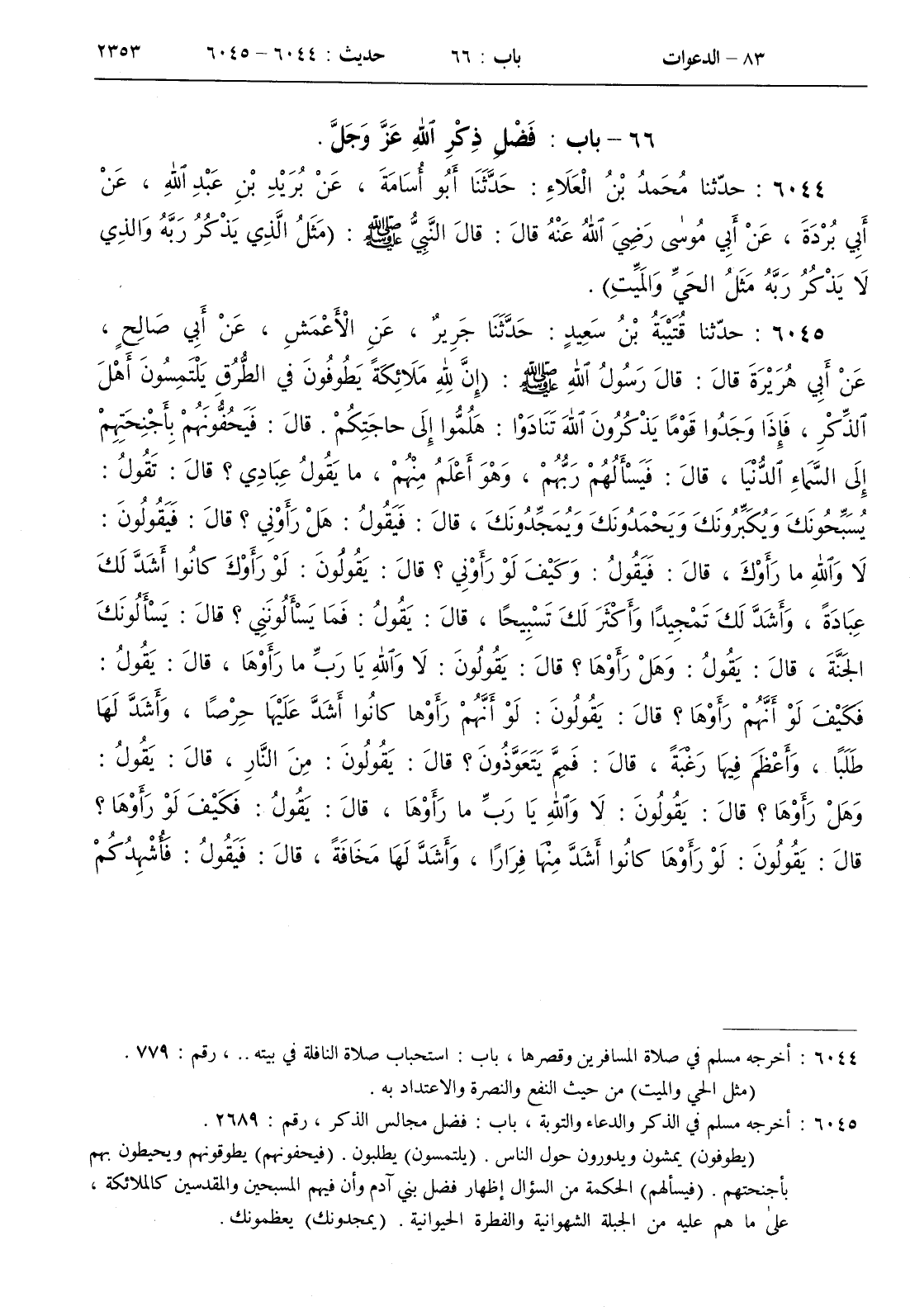 : قال رسول الله صلى الله عليه و سلم ( إن لله ملائكة يطوفون في الطرق يلتمسون أهل الذكر فإذا وجدوا قوما يذكرون الله تنادوا هلموا إلى حاجتكم . قال فيحفونهم بأجنحتهم إلى السماء الدنيا قال فيسألهم ربهم وهو أعلم منهم ما يقول عبادي ؟ قال تقول يسبحونك ويكبرونك ويحمدونك ويمجدونك قال فيقول هل رأوني ؟ قال فيقولون لا والله ما رأوك قال فيقول وكيف لو رأوني ؟ قال يقولون لو رأوك كانوا أشد لك عبادة وأشد لك تمجيدا وأكثر لك تسبيحا قال يقول فما يسألونني ؟ قال يسألونك الجنة قال يقول وهل رأوها ؟ قال يقولون لا والله يا رب ما رأوها قال يقول فكيف لو أنهم رأوها ؟ قال يقولون لو أنهم رأوها كانوا أشد عليها حرصا وأشد لها طلبا وأعظم فيها رغبة قال فمم يتعوذون ؟ قال يقولون من النار قال يقول وهل رأوها ؟ قال يقولون لا والله يا رب ما رأوها قال يقول فكيف لو رأوها ؟ قال يقولون لو رأوها كانوا أشد منها فرارا وأشد لها مخافة قال فيقول فأشهدكم أني قد غفرت لهم . قال يقول ملك من الملائكة فيهم فلان ليس منهم إنما جاء لحاجة . قال هم الجلساء لا يشقى بهم جليسهم )
