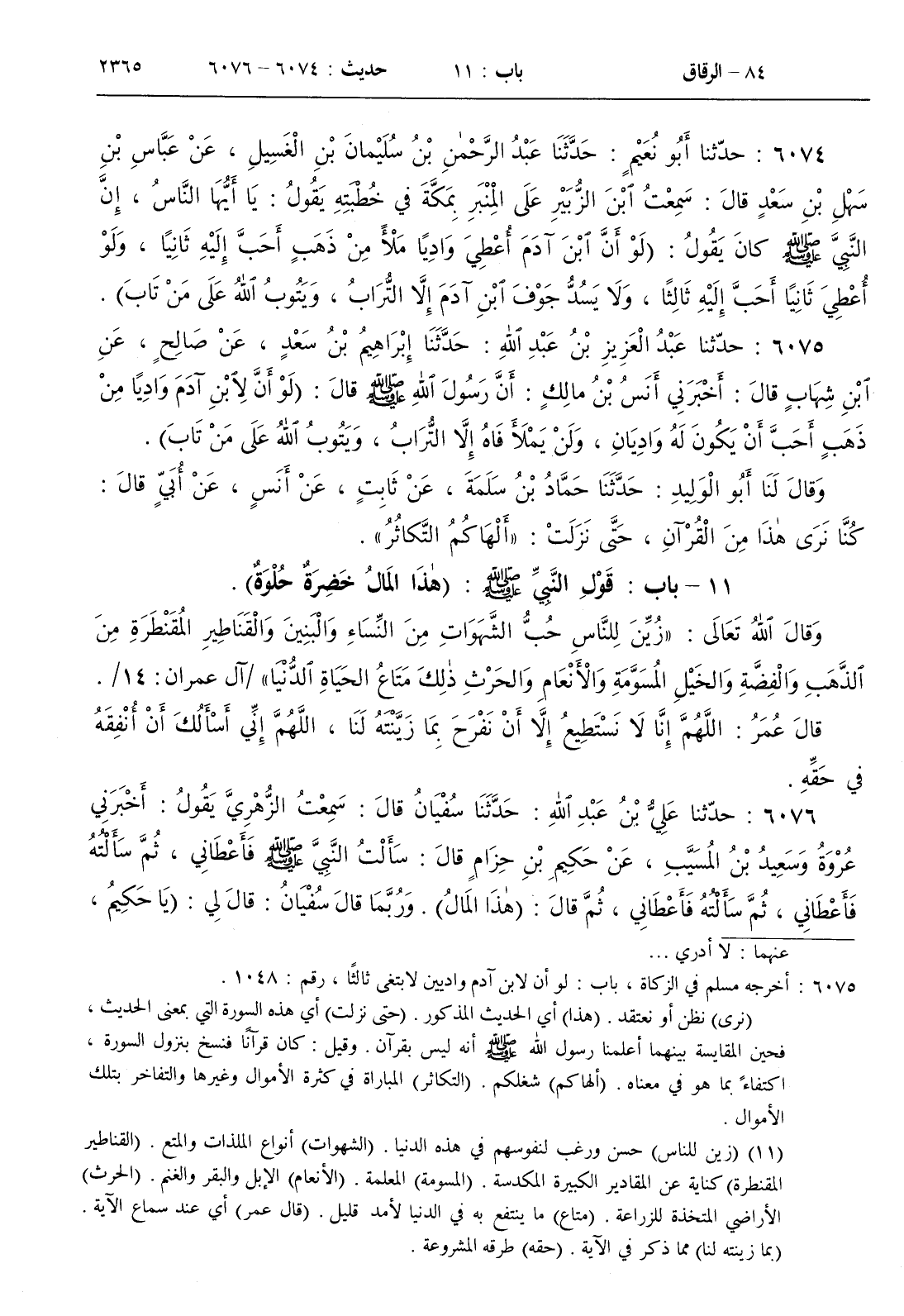 : أن رسول الله صلى الله عليه و سلم قال ( لو أن لابن آدم واديا من ذهب أحب أن يكون له واديان ولن يملأ فاه إلا التراب ويتوب الله على من تاب )