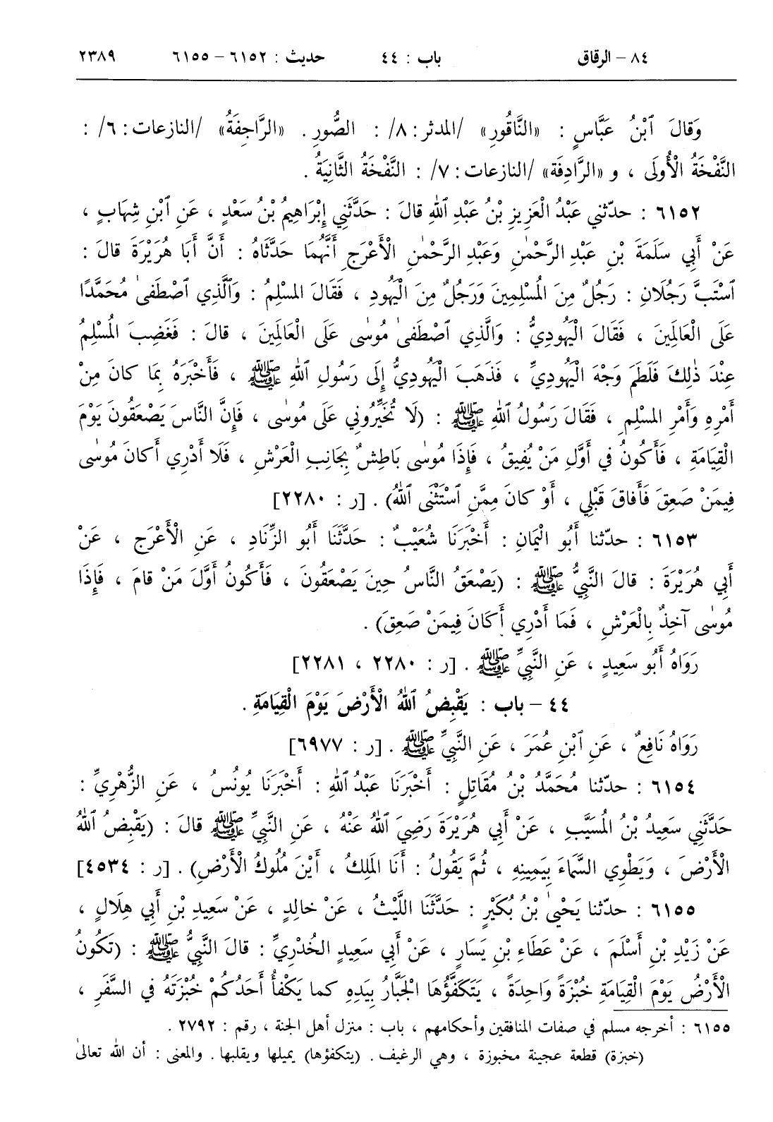 : استب رجلان رجل من المسلمين ورجل من اليهود فقال المسلم والذي اصطفى محمدا على العالمين فقال اليهودي والذي اصطفى موسى على العالمين قال فغضب المسلم عند ذلك فلطم وجه اليهودي فذهب اليهودي إلى رسول الله صلى الله عليه و سلم فأخبره بما كان من أمره وأمر المسلم فقال رسول الله صلى الله عليه و سلم ( لا تخيروني على موسى فإن الناس يصعقون يوم القيامة فأكون في أول من يفيق فإذا موسى باطش بجانب العرش فلا أدري أكان موسى فيمن صعق فأفاق قبلي أو كان ممن استثنى الله )