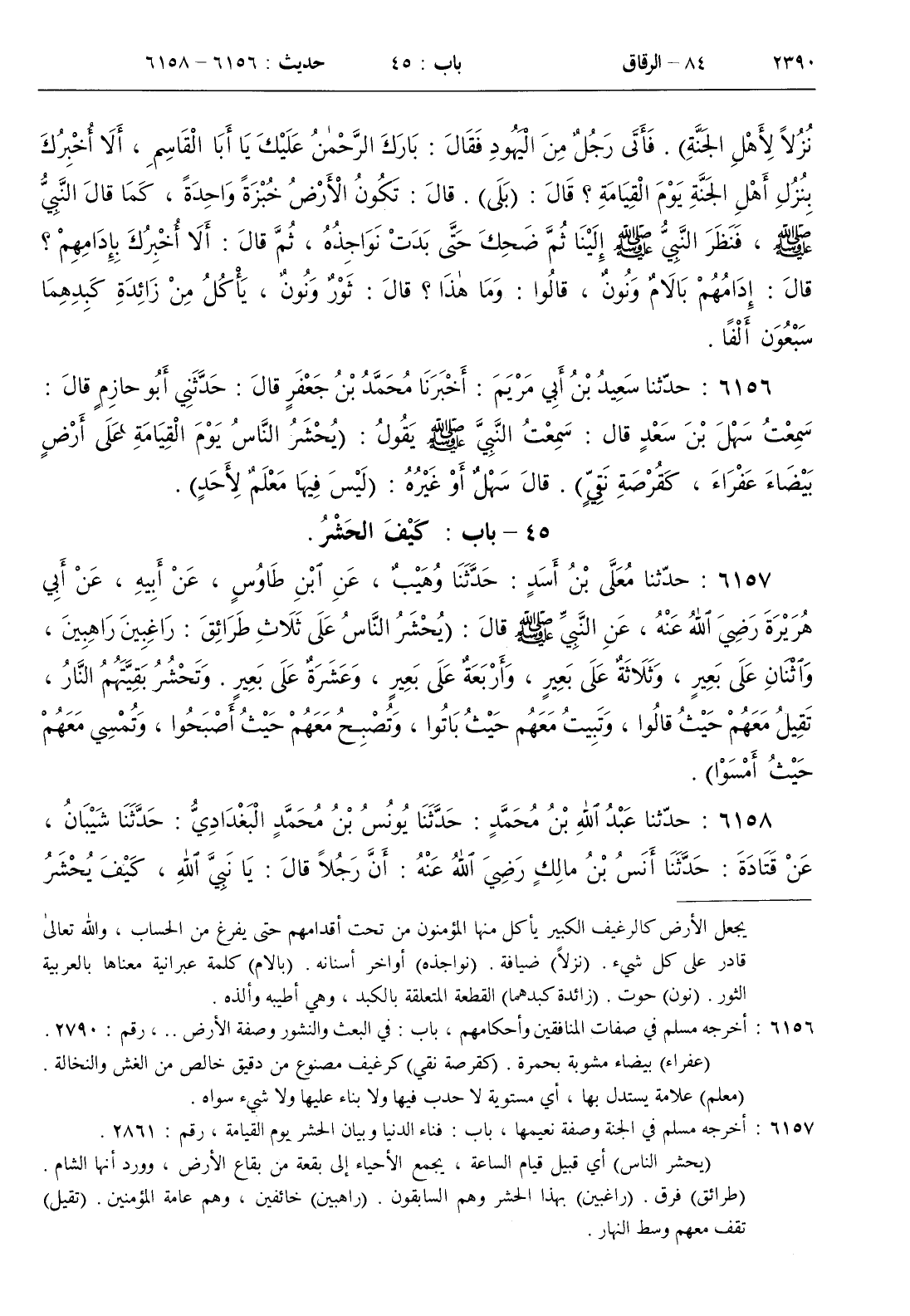 : سمعت النبي صلى الله عليه و سلم يقول ( يحشر الناس يوم القيامة على أرض بيضاء عفراء كقرصة نقي ) . قال سهل أو غيره ( ليس فيها معلم لأحد )