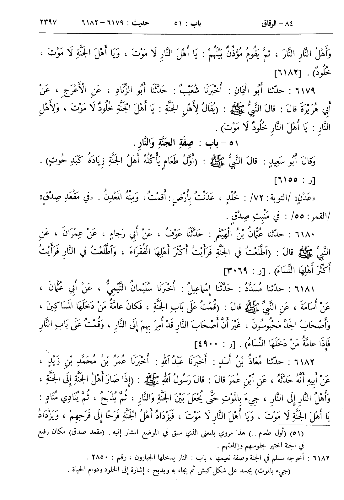 : قال النبي صلى الله عليه و سلم ( يقال لأهل الجنة يا أهل الجنة خلود لا موت ولأهل النار يا أهل النار خلود لا موت )